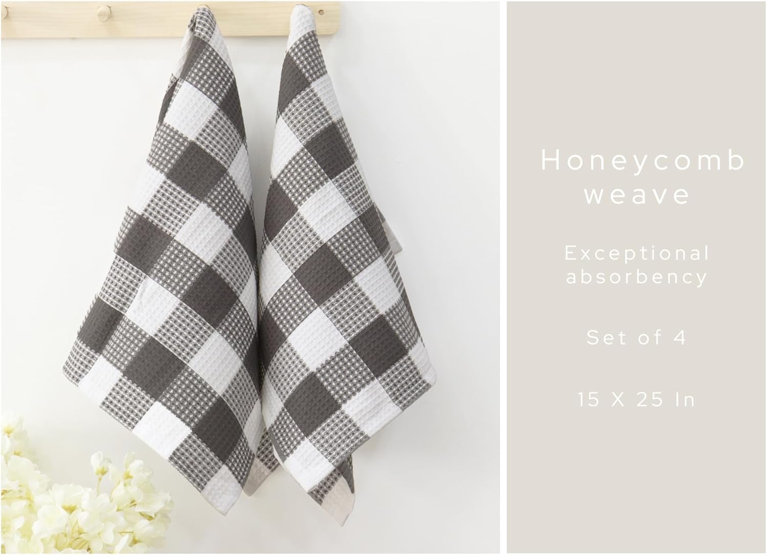 - Pack of 4 Waffle Weave Dish Towels measuring 15 by 25 Inches.