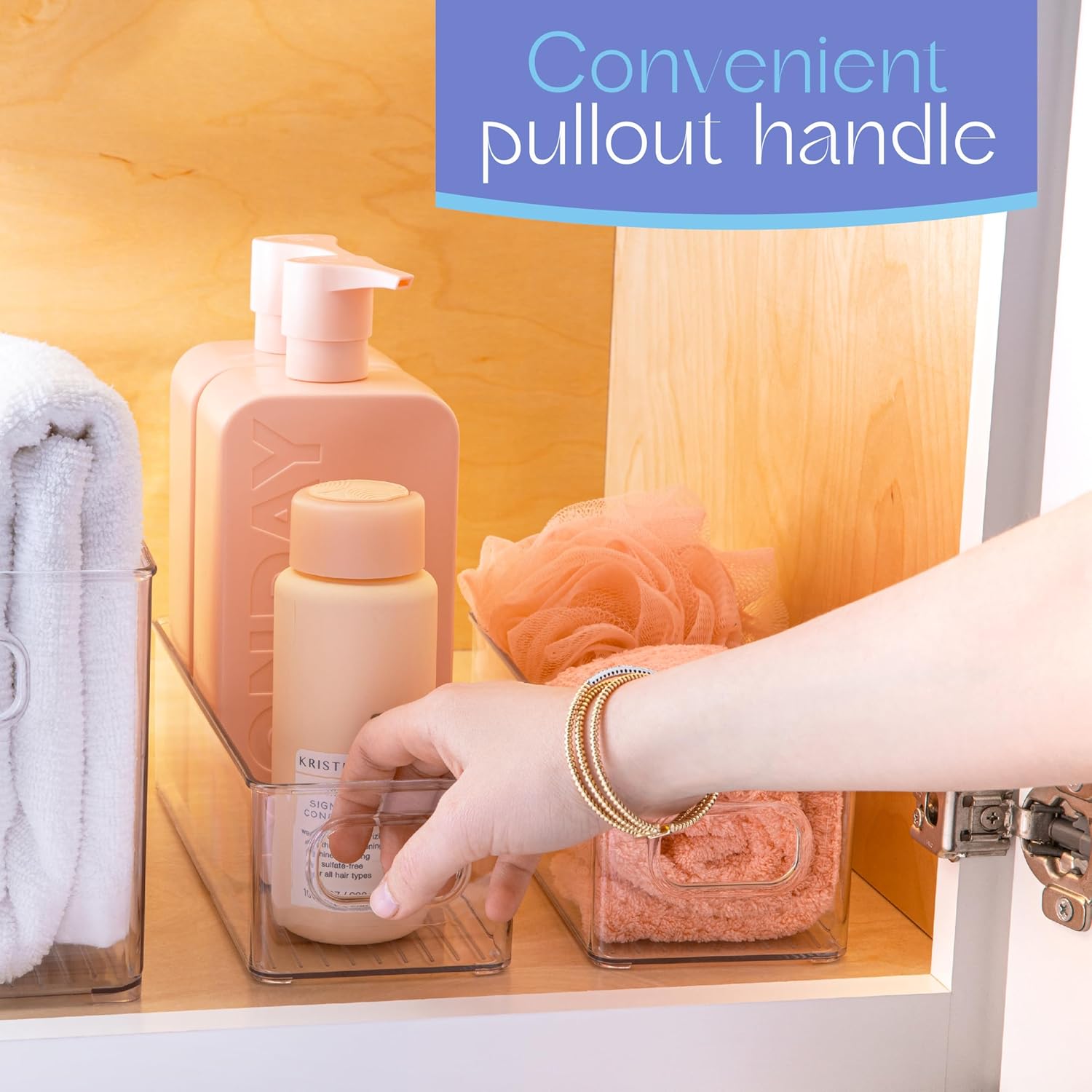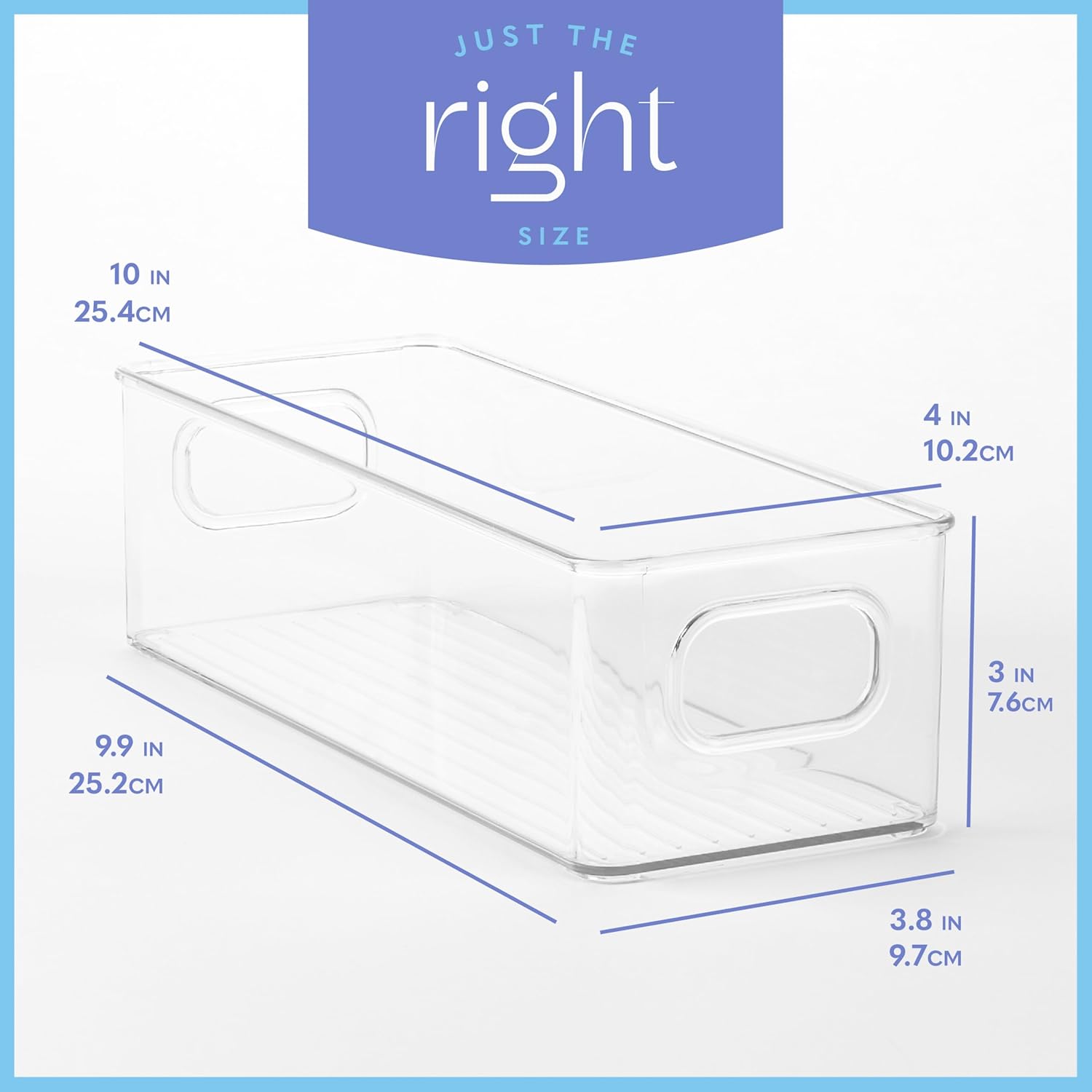Plastic Food Storage Clear Container 2 Pack Bin with Handles for Organizing Kitchen, Pantry, Refrigerator, Freezer, Pantry, Cabinet, Closet, Bathroom. Stackable 10”x4”x3”