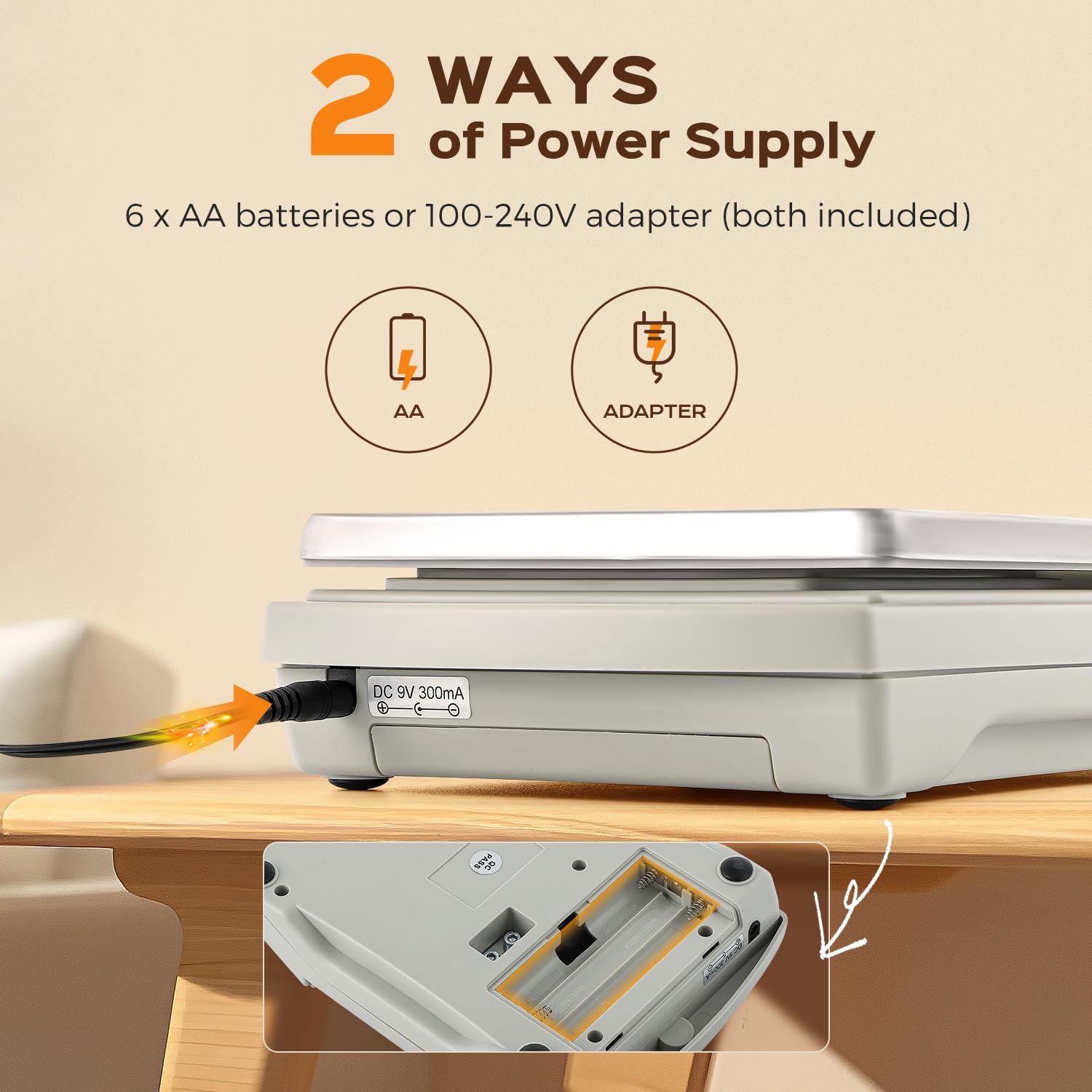 - Two Powering Modes-The food weighing scale can be powered both by 100-240V AC adapter (included) and 6pcs AA batteries (included).
