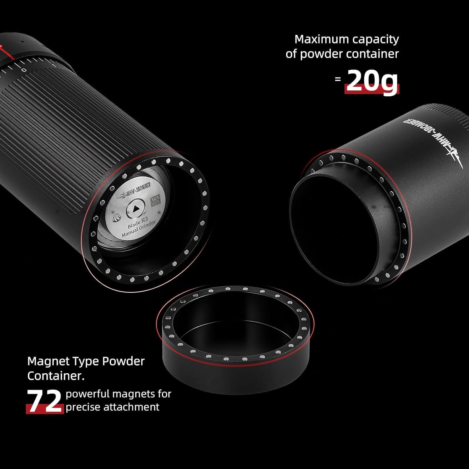 - 【Magnetic Bin Convenience】Discover the ultimate convenience of our handheld coffee grinder burr's magnetic powder bin. Equipped with 72 robust magnets, it securely attaches to the grinder's base, ensuring spill-proof usage. Unlike conventional knob-type containers, this design offers effortless mounting. It features a spacious 20g capacity, which you can increase by removing the bottom screen.