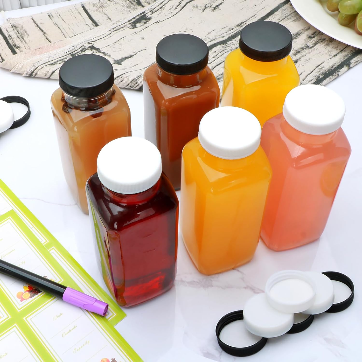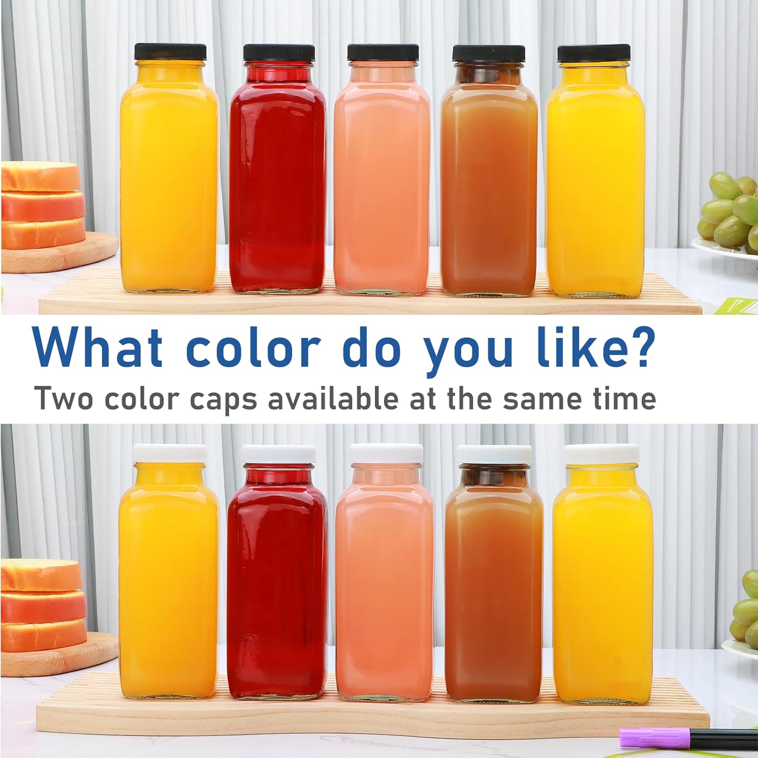 Brajttt Glass Juice Bottles with Lids, 12 OZ Juicing Bottles Reusable Glass, Set of 12 Square Beverage Containers Drinking Jars for Milk,Juice,Tea,Milkshake, Water,Honey,Jam