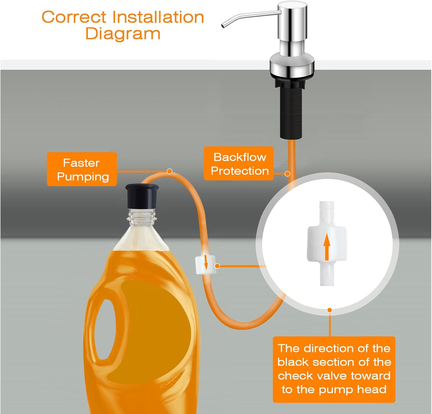 - What You Get: One soap dispenser pump head, 2 tubes, one bottle stopper to fit all soap containers, a check valve connects two-tube, anti-leak accessories and 3 fastening bolts.