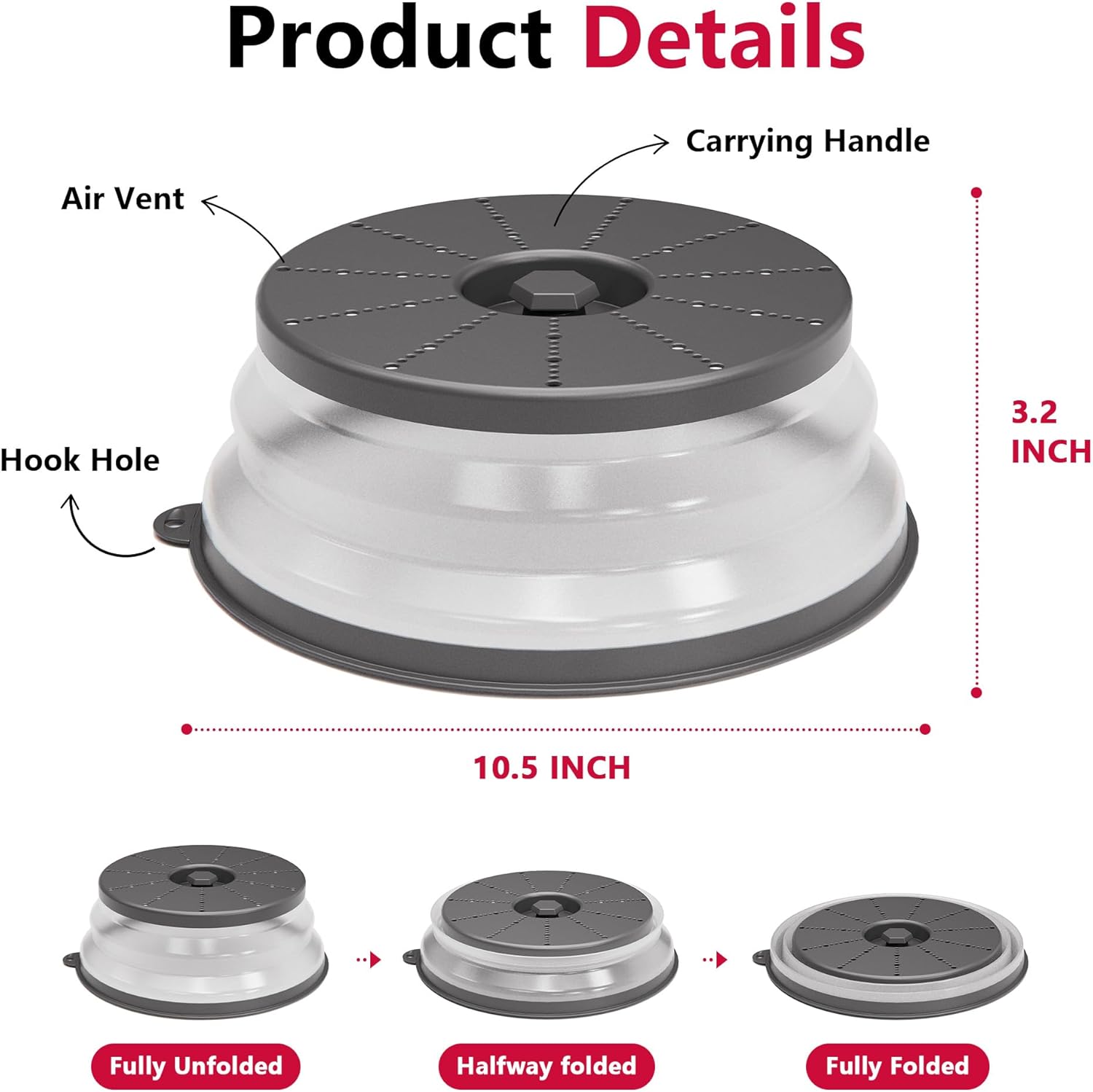 - Easy to Store: The foldable microwave splatter cover pops up to 3.2 inches to cover tall plates, food stacks, and shallow bowls. It also folds down to 0.72 inches when not in use. And features a hook hole for easy storage, saving you more space.