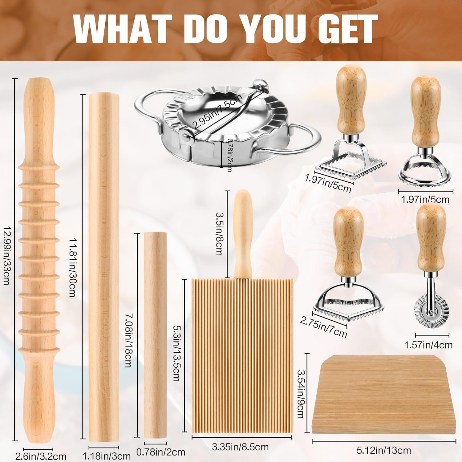 - Dumpling and Pasta Making Tool Set: The package includes 1 set of dumpling stamps (1 mold and 1 lid), 1 dumpling maker, 1 wooden Italian pasta cutter, 1 dumpling rolling pin, 1 gnocchi board, 1 wooden stick, 1 dough scraper, 4 dumpling mold knives (1 round, 1 square, 1 roller, 1 heart-shaped), and multiple dumpling press pasta making tools; an ideal combination to meet your needs for making dumplings and pasta.