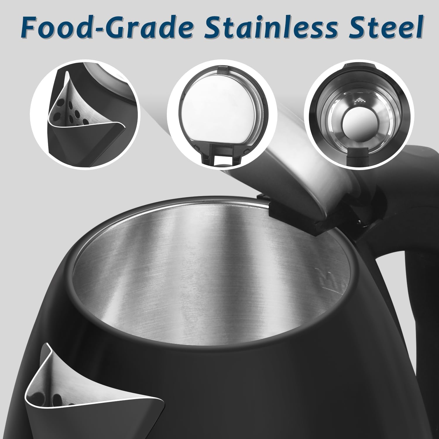 - [Friendly & Modern Design]: With its comfortable silicone handle and kettle spout designed with a filter hole, this electric kettle helps prevent burns when handling. The 360Β° rotating base, equipped with a power cord that can be wrapped around it, ensures safe use and convenient storage. The sleek and modern design of the black stainless steel surface is more favored by young people.
