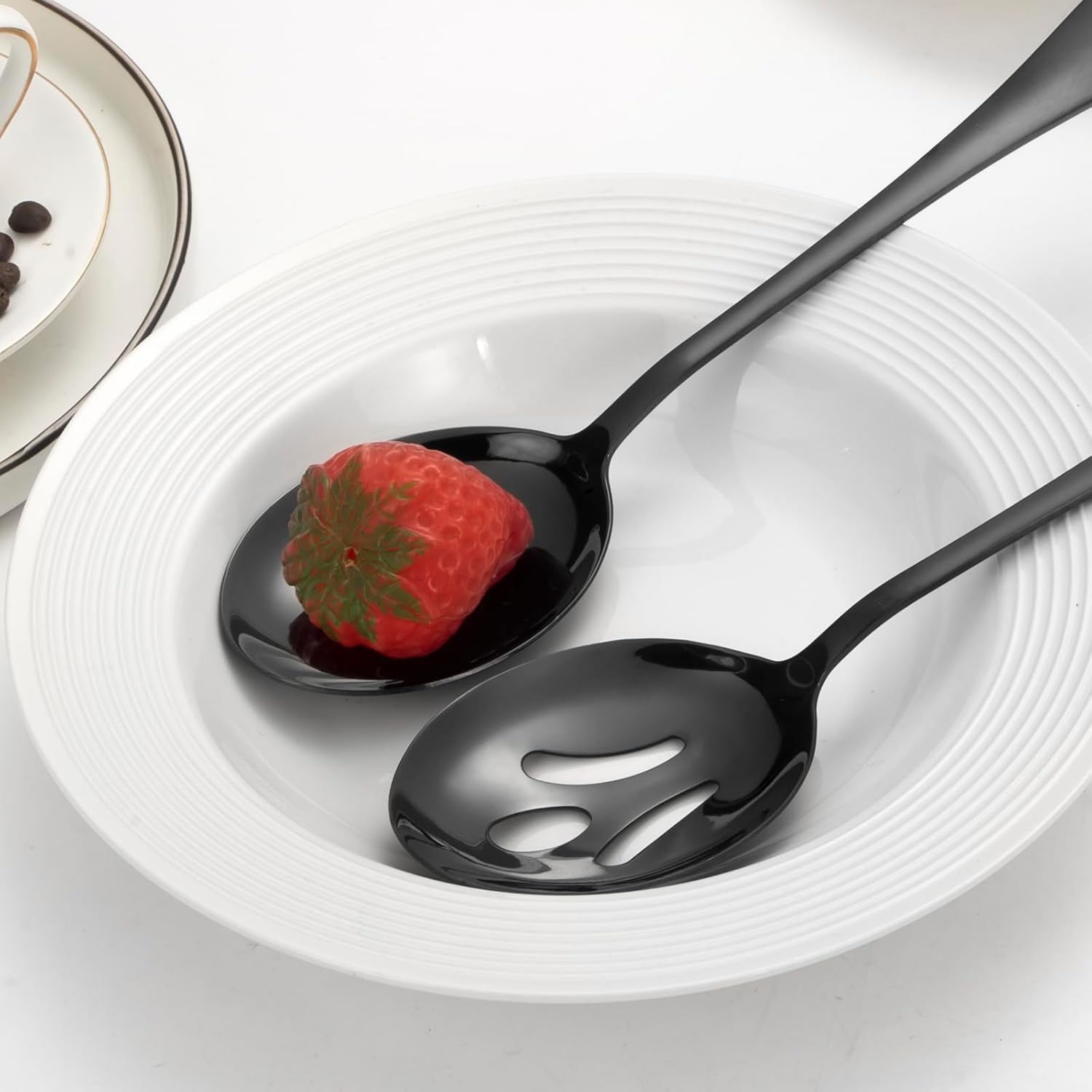 - 12 Pieces Black Serving Flatware Set: from this package you will receive 4pcs slotted serving spoons, 4pcs serving spoons, 2pcs serving fork, and 2pcs serving tongs