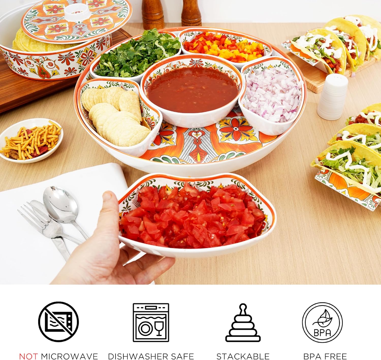 - Mutil-functional Taco Bar Design: This versatile platter is more than just a serving tray. Use it to organize your kitchen, serve a lot of snacks, or even as a stylish centerpiece. Its multifunctional design caters to all your hosting and organizing needs