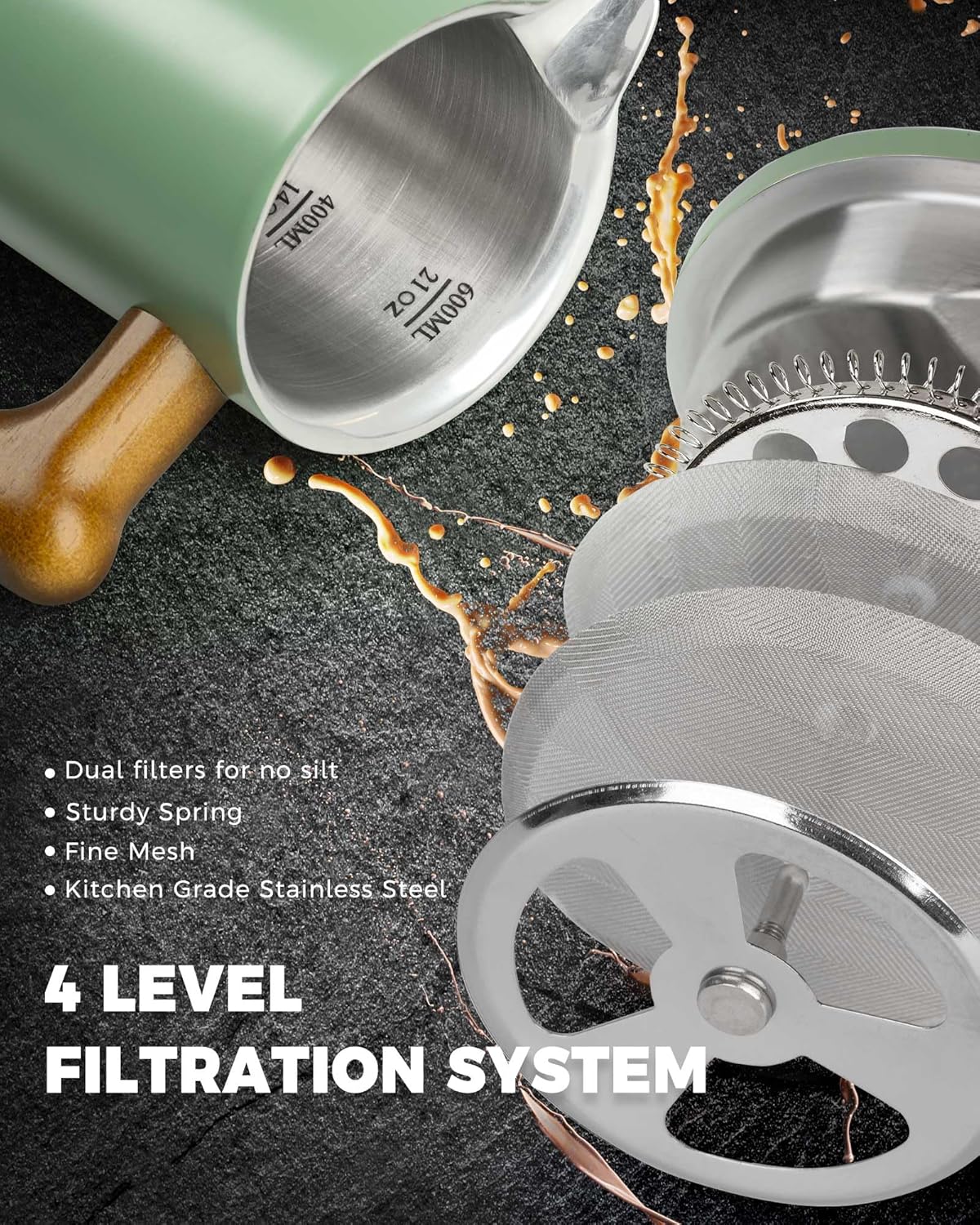 - SUPERIOR FILTRATION SYSTEM: This french press coffee maker is equipped with dual filters screens to minimize sediment in your cup, ensuring a clean and pure coffee experience. The package also comes with two replacement filters to extend the life of the coffee press.