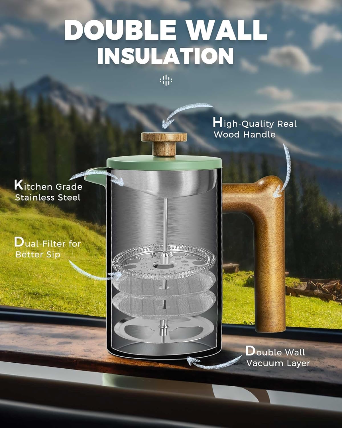 - EXQUISITE COLOURS & REAL WOOD HANDLE: Featuring a long-lasting, scratch-resistant exterior paint and a real wood handle, the french press cofffee maker boasts a vintage look that decorates every corner of your home and enhances your quality of life.