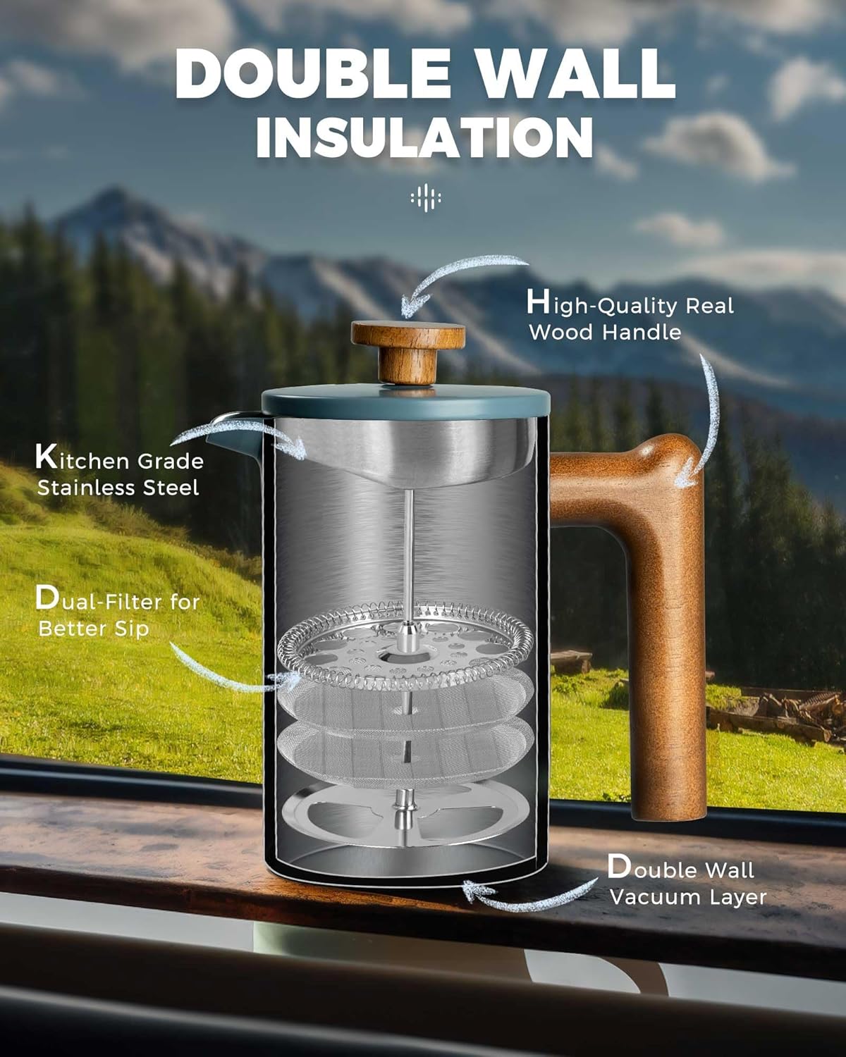 POLIVIAR French Press Coffee Maker, 21 oz Coffee Press with Real Wood Handle, Double Wall Insulation & Dual-Filter Screen, Food Grade Stainless Steel for Good Coffe and Tea, JX2024-SFPU