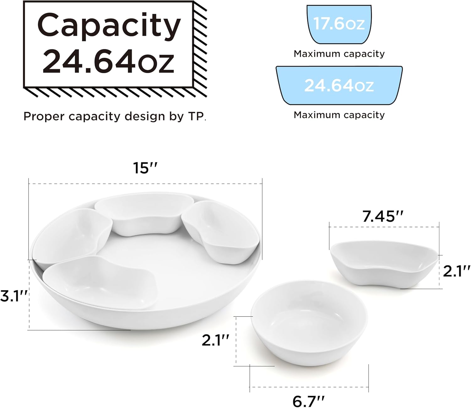 - Taco Serving Platter Details: Experience the ultimate convenience with our 15" 360Β° rotating platter, which includes five 7.45" ingredient trays and a 6.7" dipping bowl. Together, they offer a maximum capacity of 24.64 ounces, making it perfect for all your serving needs. NOTE: NOT MICROWAVABLE