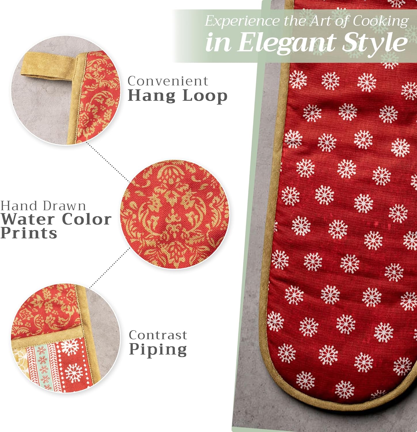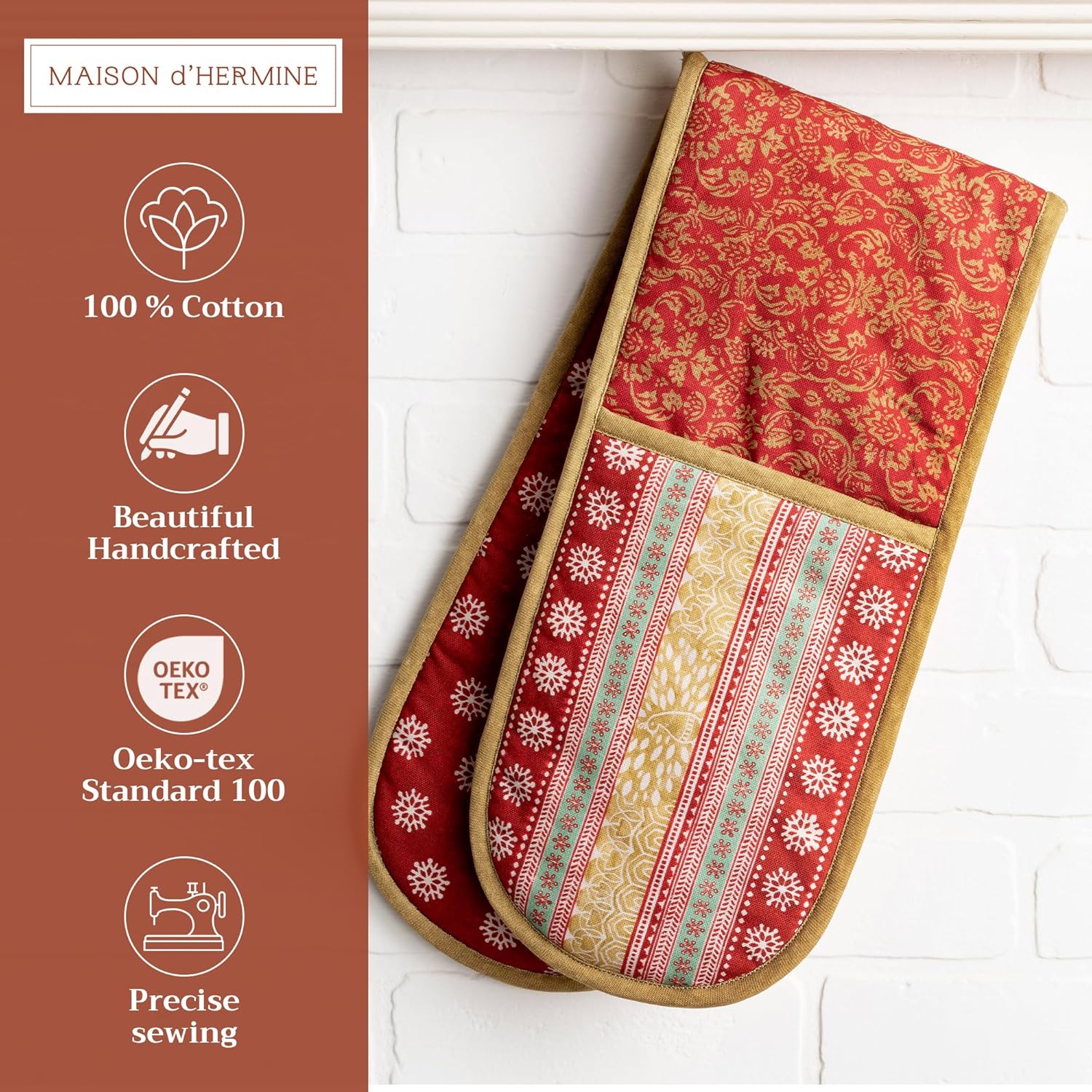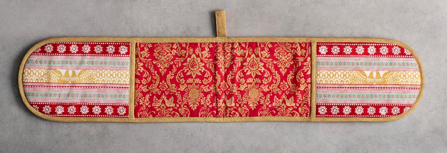 - Package includes: Includes 1 double oven mitt sized 7"x35". Perfect for handling hot cookware safely while adding a touch of European elegance to your kitchen. Designed in Europe and made in India with care