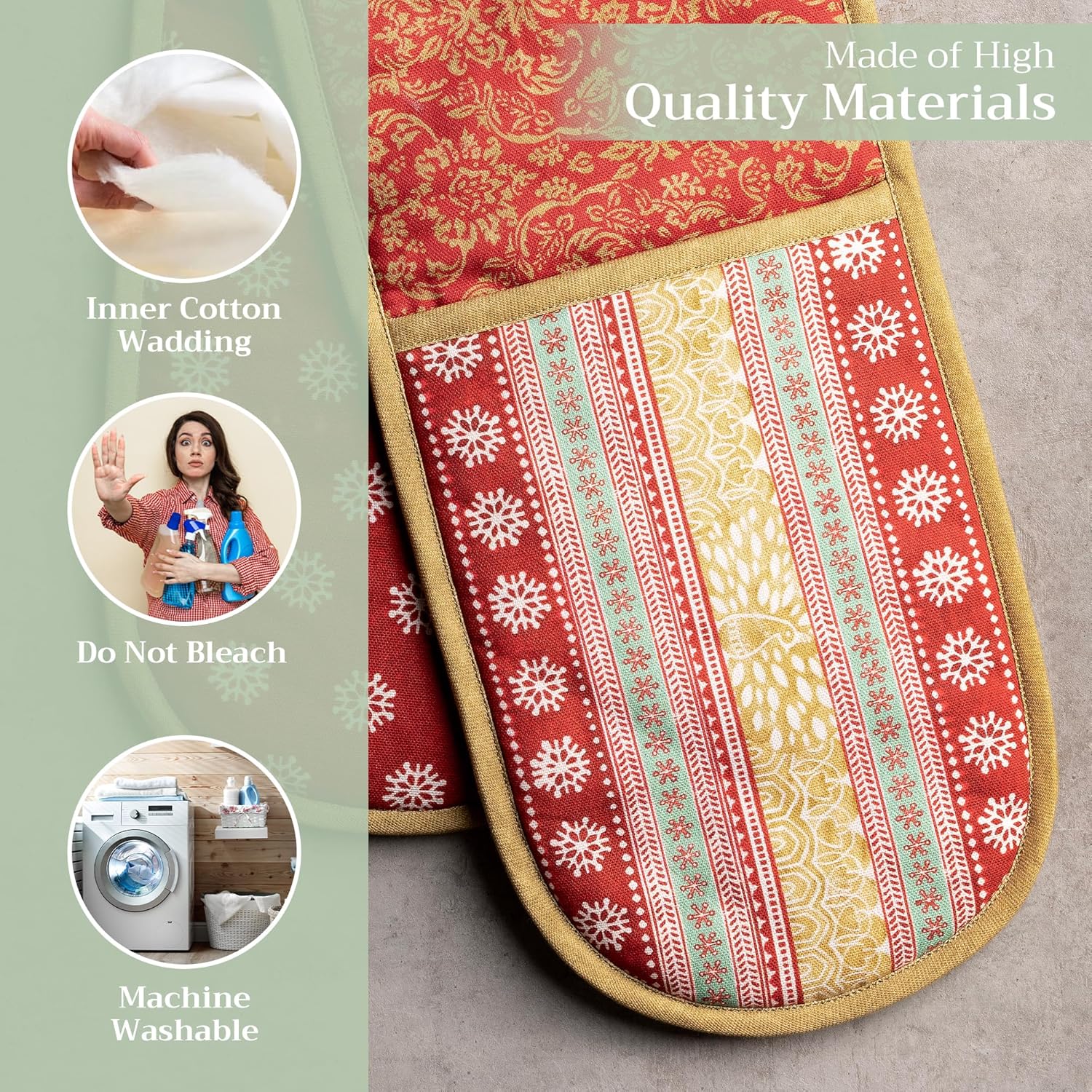 - 100% Quilted cotton: Crafted from premium quilted cotton for superior heat resistance and durability. This double oven mitt offers a soft, flexible grip and protects your hands during baking, roasting, or grilling