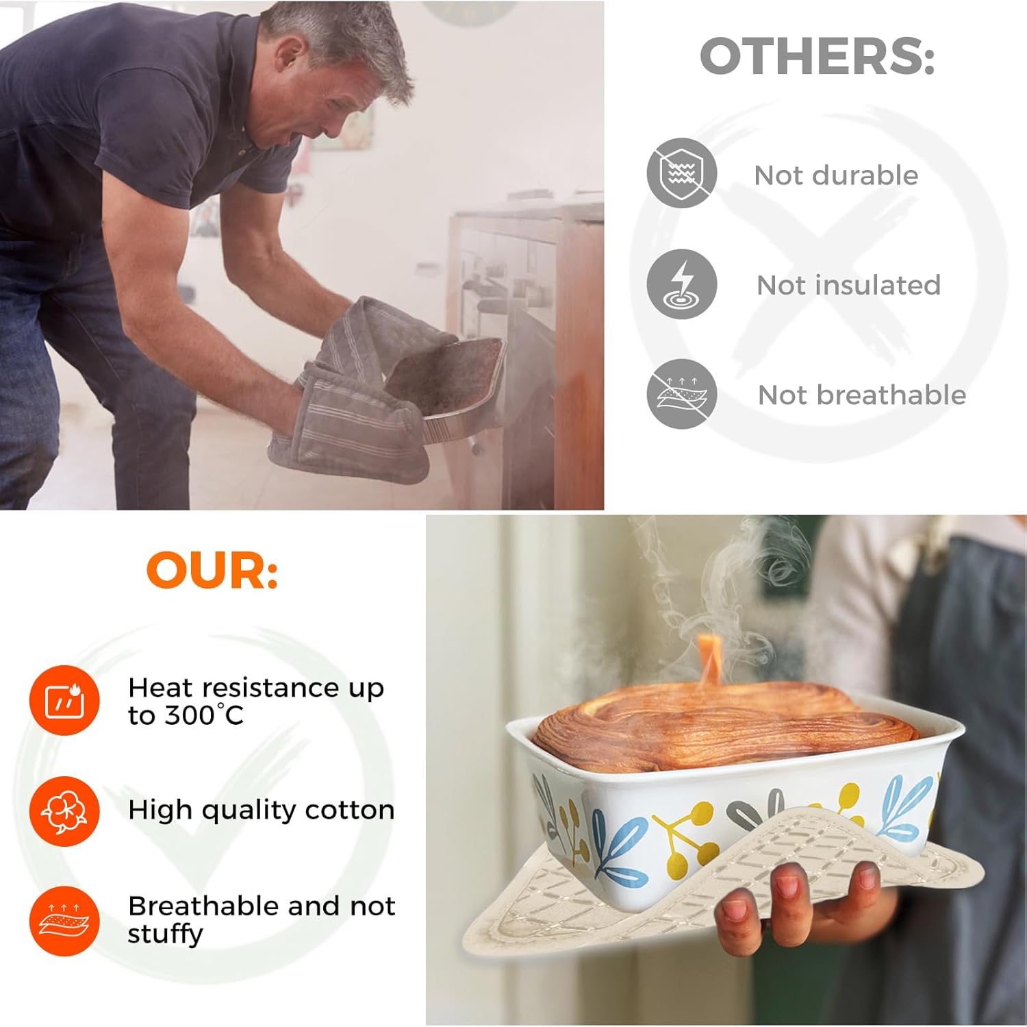 - ✅【Heat resistant up to 500 °F】Our high-quality oven mitts and pot holder set is heat-resistant up to 500 °F. Whether you're taking a casserole dish out of your oven, taking a pan out of your oven, or taking care of your hot grill, you can be sure that your hands are reliably protected from burns by our oven mitts.