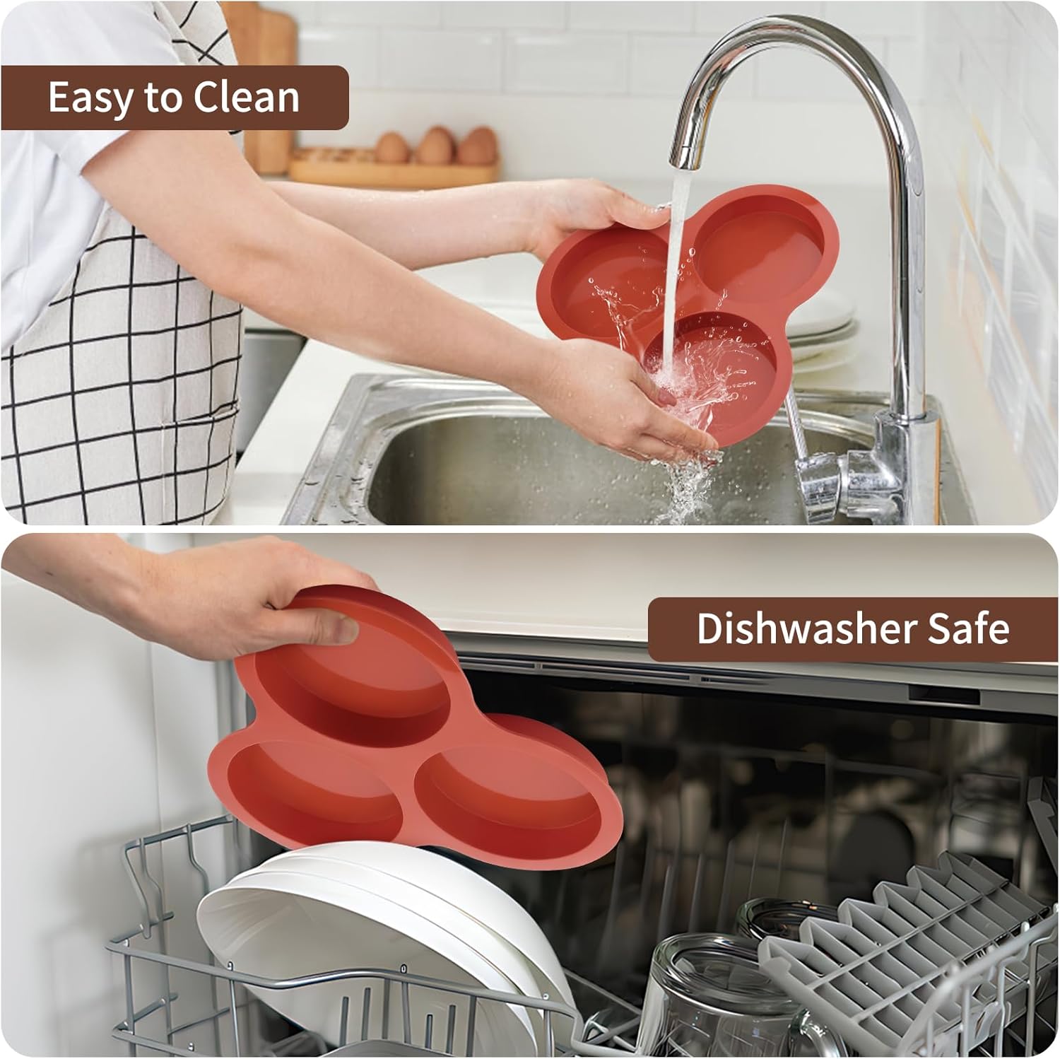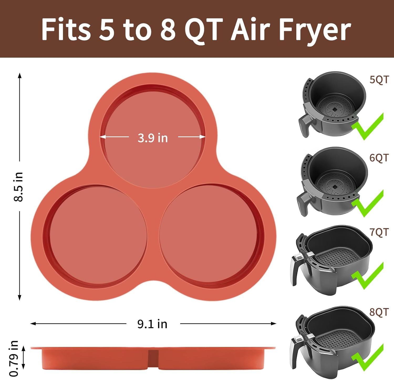 - Air Fryer Accessories: You will get 2pcs silicone air fryer egg pans with 3 cavities in each pan, each cavity measures 4 inch x 3/4 inch (Deep), you can easily add vegetables, cheese, cooked ham, bacon and other various ingredients to quickly make the perfect hamburger or breakfast sandwich