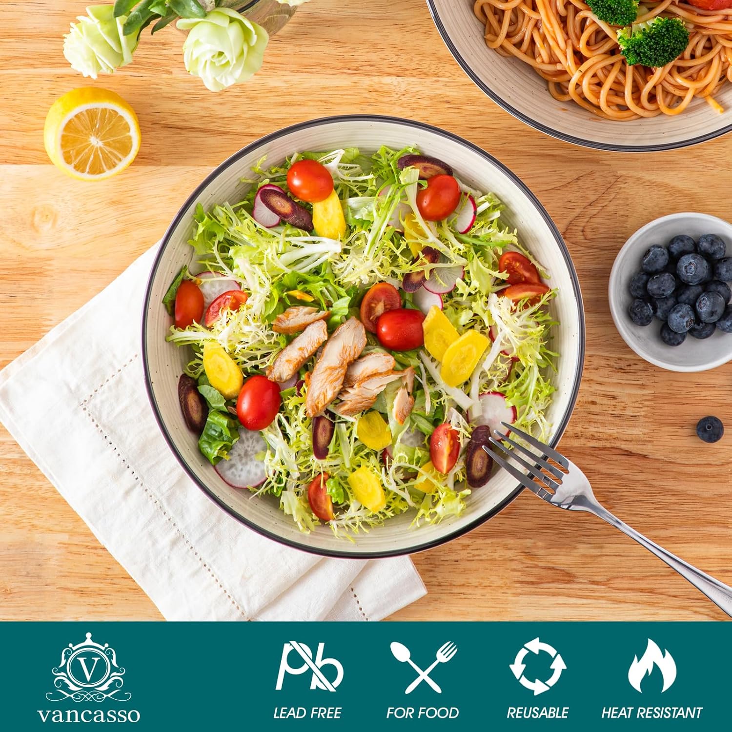 - 【Multifunctional Pasta Bowls】 These shallow bowls set are suitable for soups, cereal, burrito bowls, stir fries, seafood, stews, casseroles, and more. vancasso pasta bowls are suitable for all delicious food
