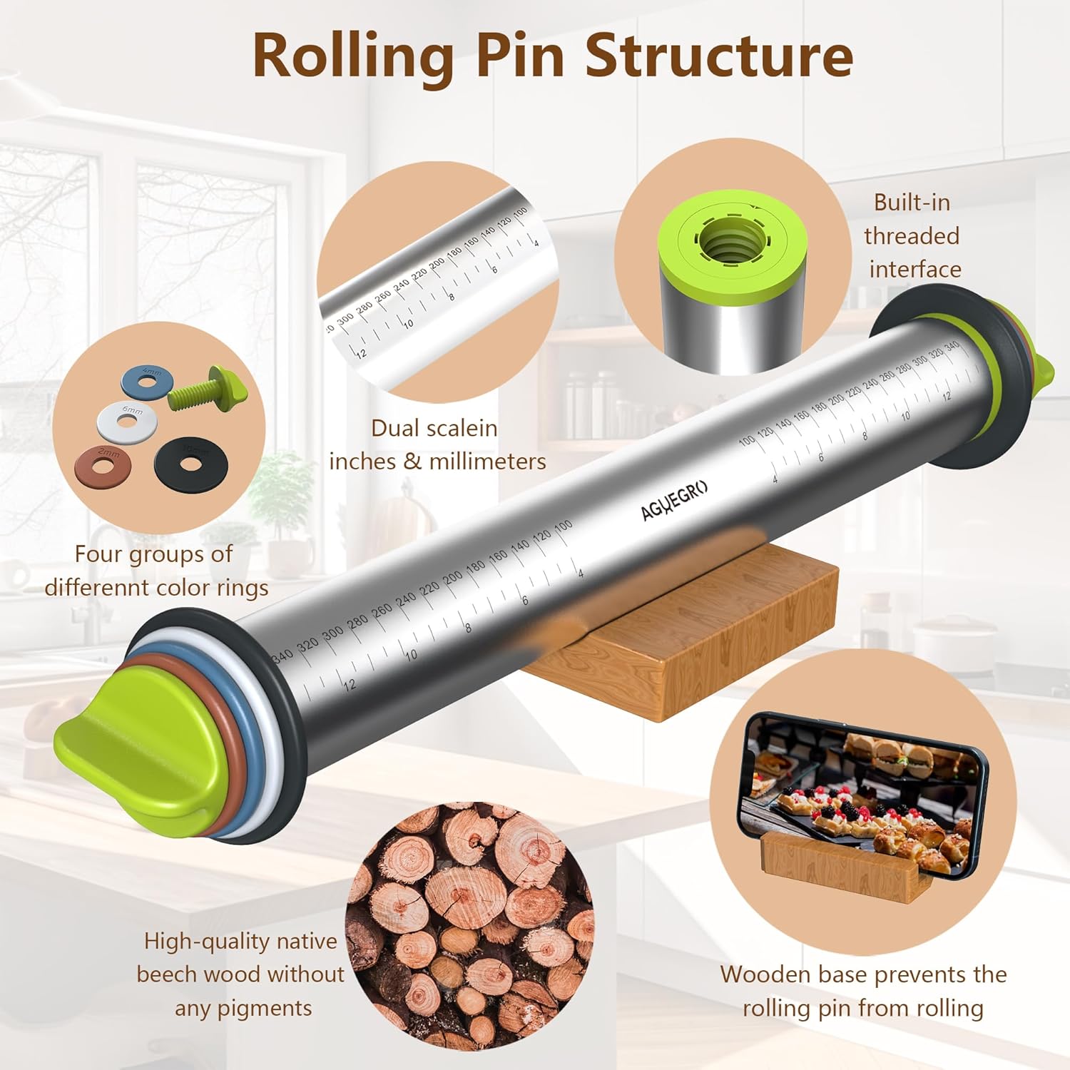 - 🍕【BAKING SUPPLIES TOOLS】 Aguegro adjustable high-quality stainless steel rolling pin is an essential kitchen tool. Perfect for making pizza dough, pie crust, bread, toast and cookie dough with consistent thickness and smoothness.It can also be preferred as the best gift.