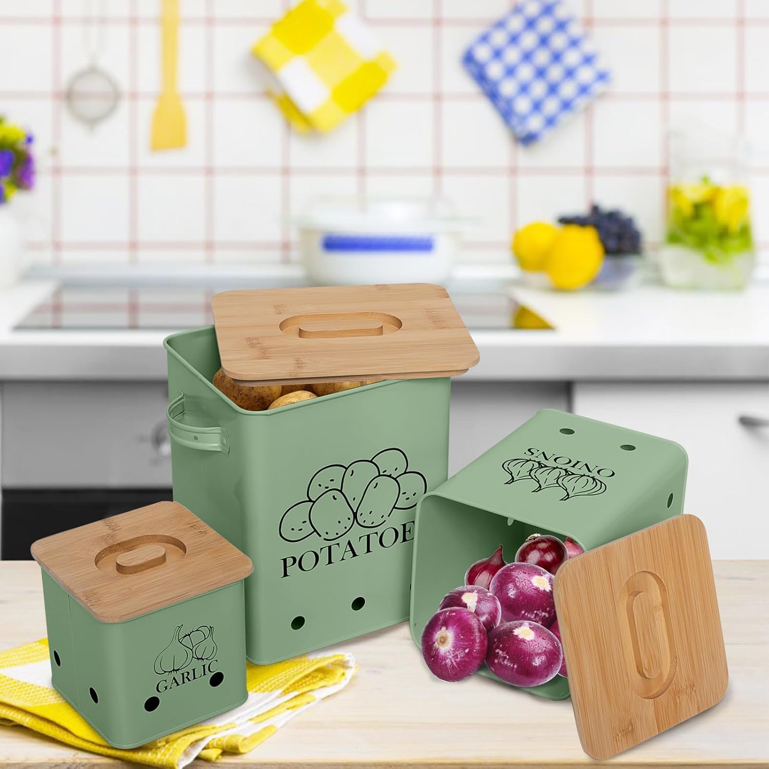 Kitchen Canisters Set, Storage Bin for Potato Onion & Garlic, 3 Pack Set Countertop Pots Containers with Wooden Lid - Potato Storage, Garlic Bin, Onion Keeper Tin with Aerating Holes-Green