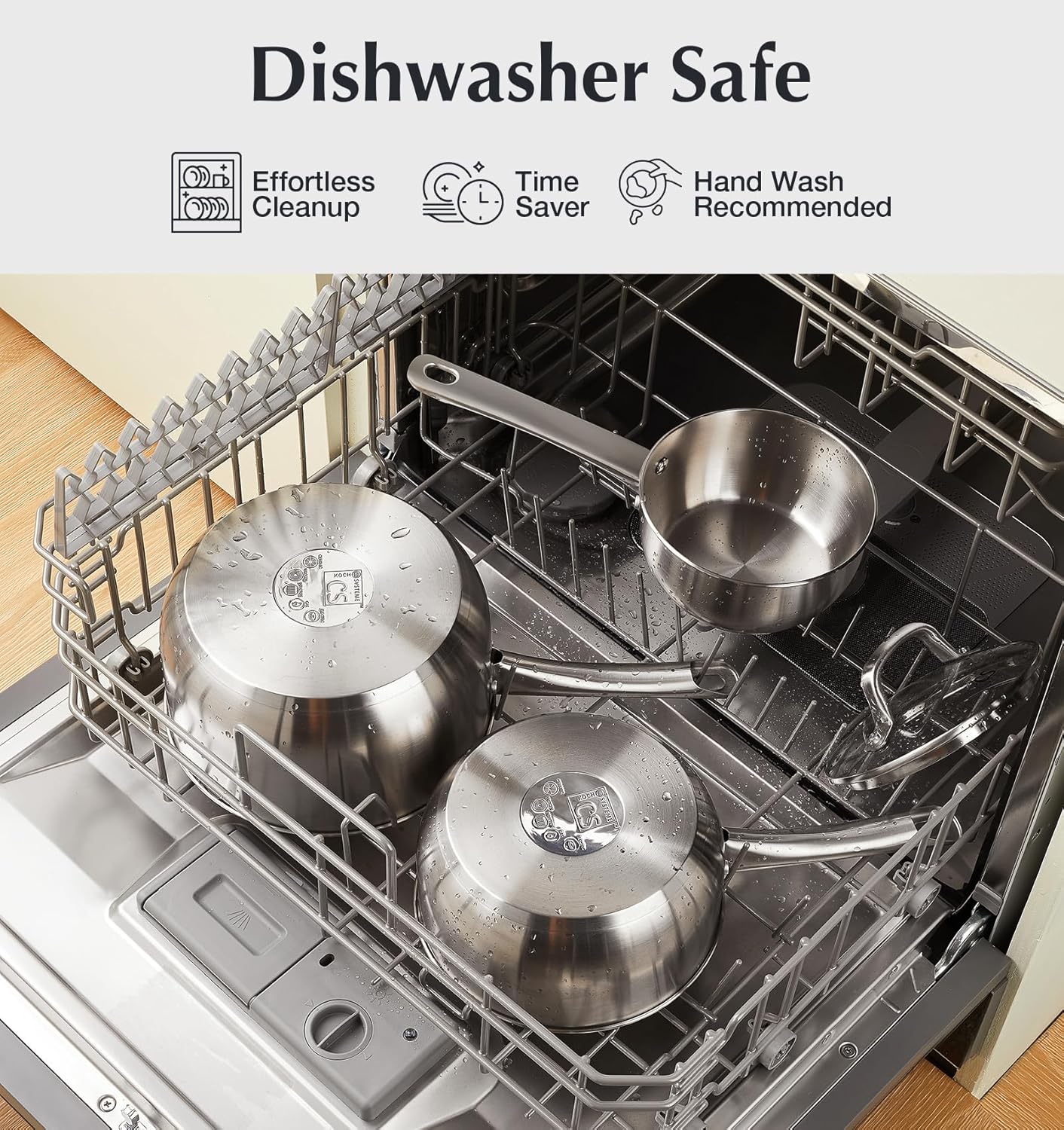 - Simple Maintenance: The premium brushed finish stainless steel of sauce pan is dishwasher safe, making cleaning a breeze. It also resists discoloration and retains its appearance over time, ensuring the set’s long-lasting quality.