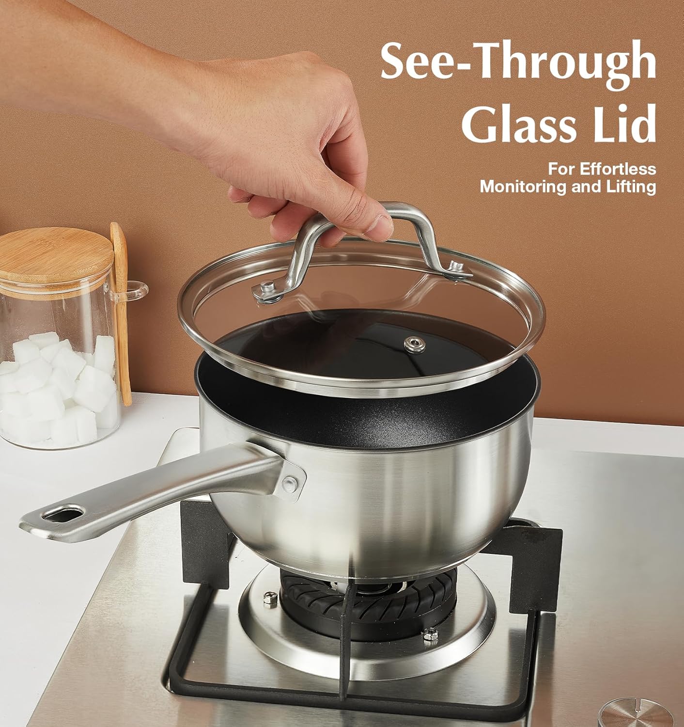 - Glass Lid & Cool-Touch Handle: The glass lid of this 3 quart stainless steel saucepan seals in flavor and nutrients, enhancing the taste and nutritional benefits of your meals. Its cool-touch handle ensures a comfortable and secure grip, eliminating the need for pot holders or oven mitts while cooking