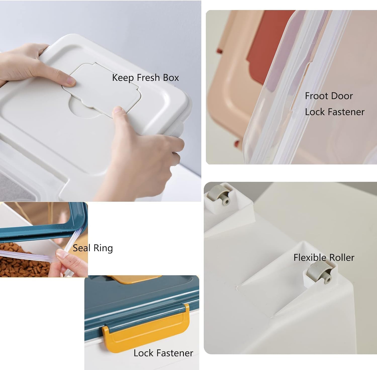 - Double sealing treatment, the front of the plastic dog food storage bin has a groove that can be easily taken out the box, with lids, convenient to use ; two castors in the bottom for convenient for daily carry and easy to move; food container uses a special design to assures food to stay fresh longer and keeps goods in containers secure.