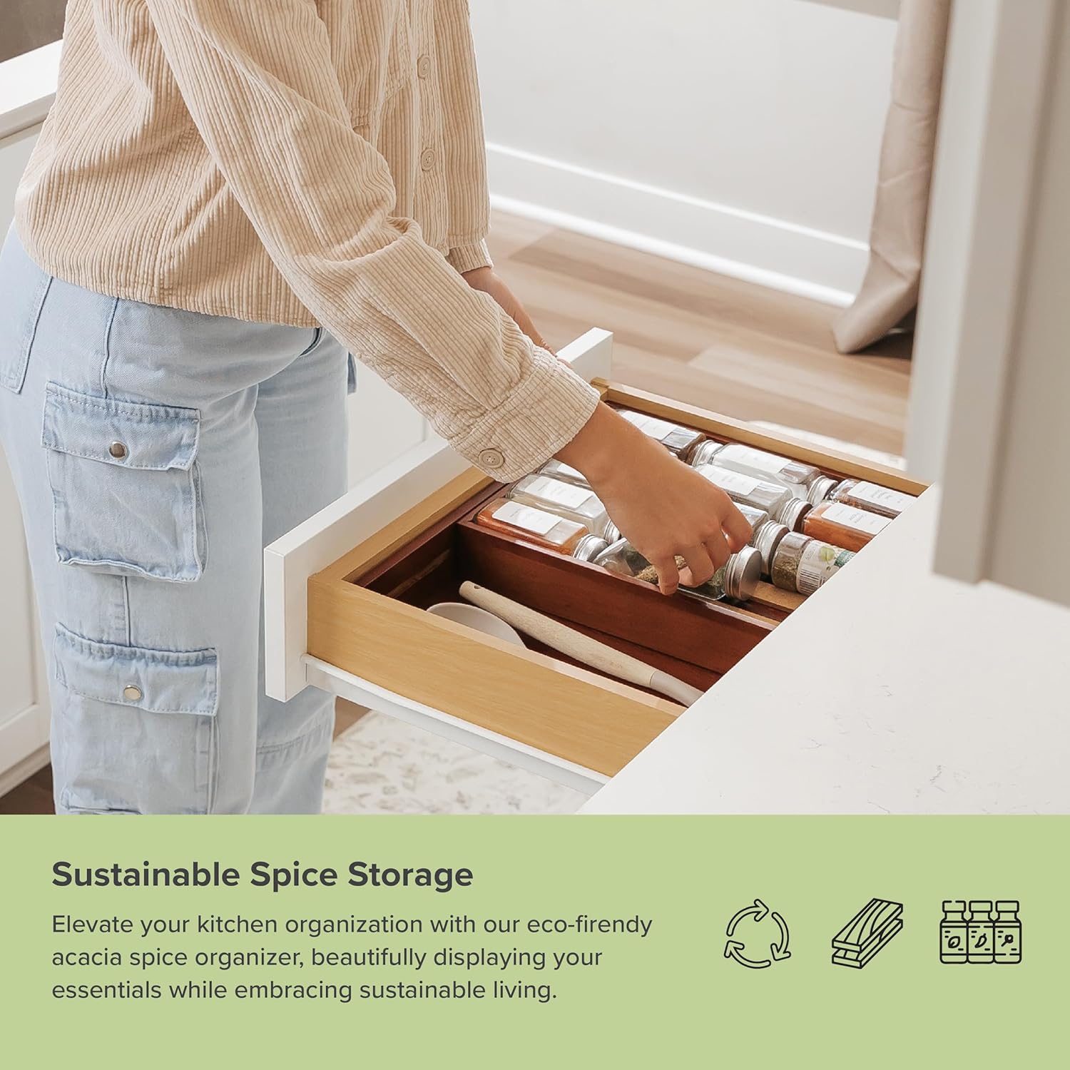 KitchenEdge Spice Drawer Organizer with Expandable Storage. Holds up to 15 Spice Jars (Not Included), Non-Slip Feet, Kitchen Accessory Storage, 100% Sustainable Bamboo Wood (Natural Acacia)