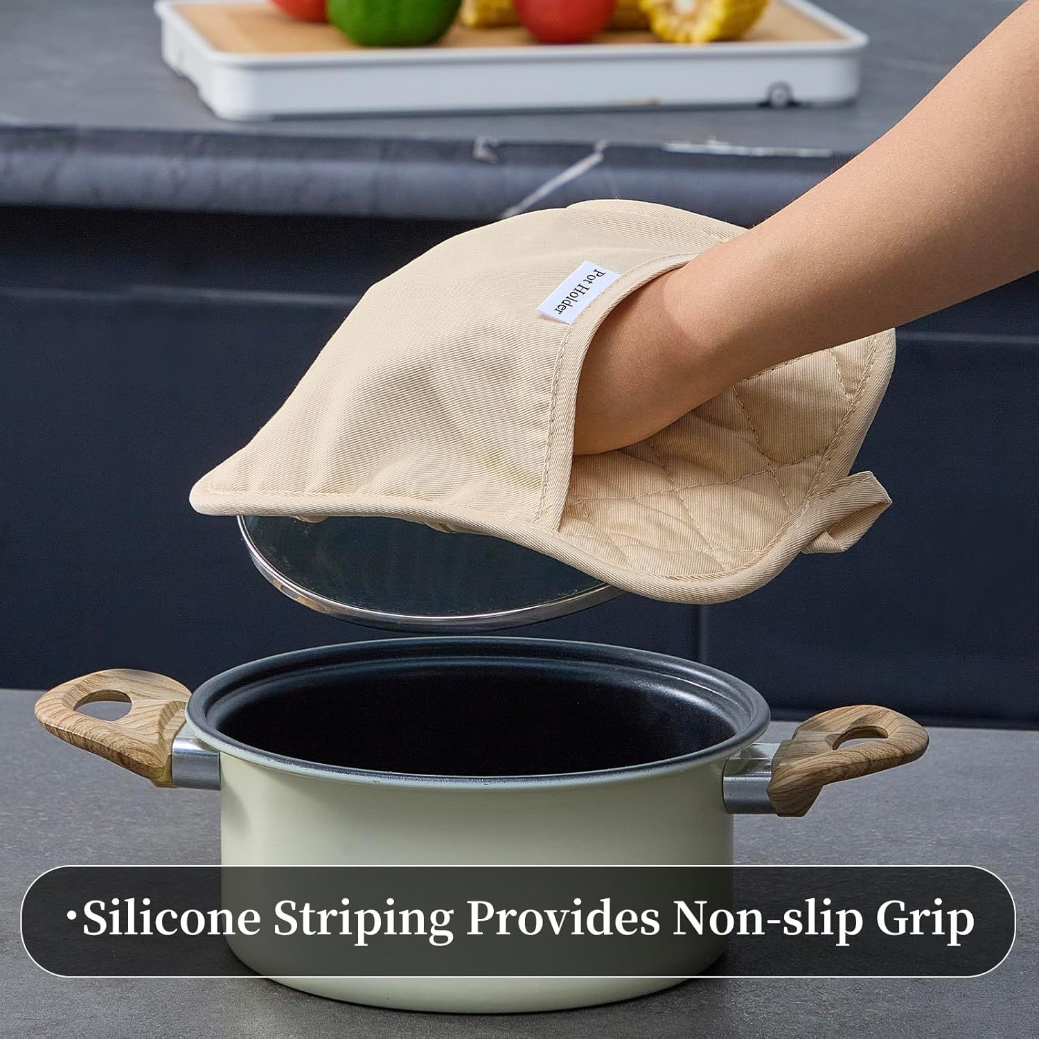 - The printed silicone design on the pot holders provide a secure non-slip grip while handling pots and pans.
