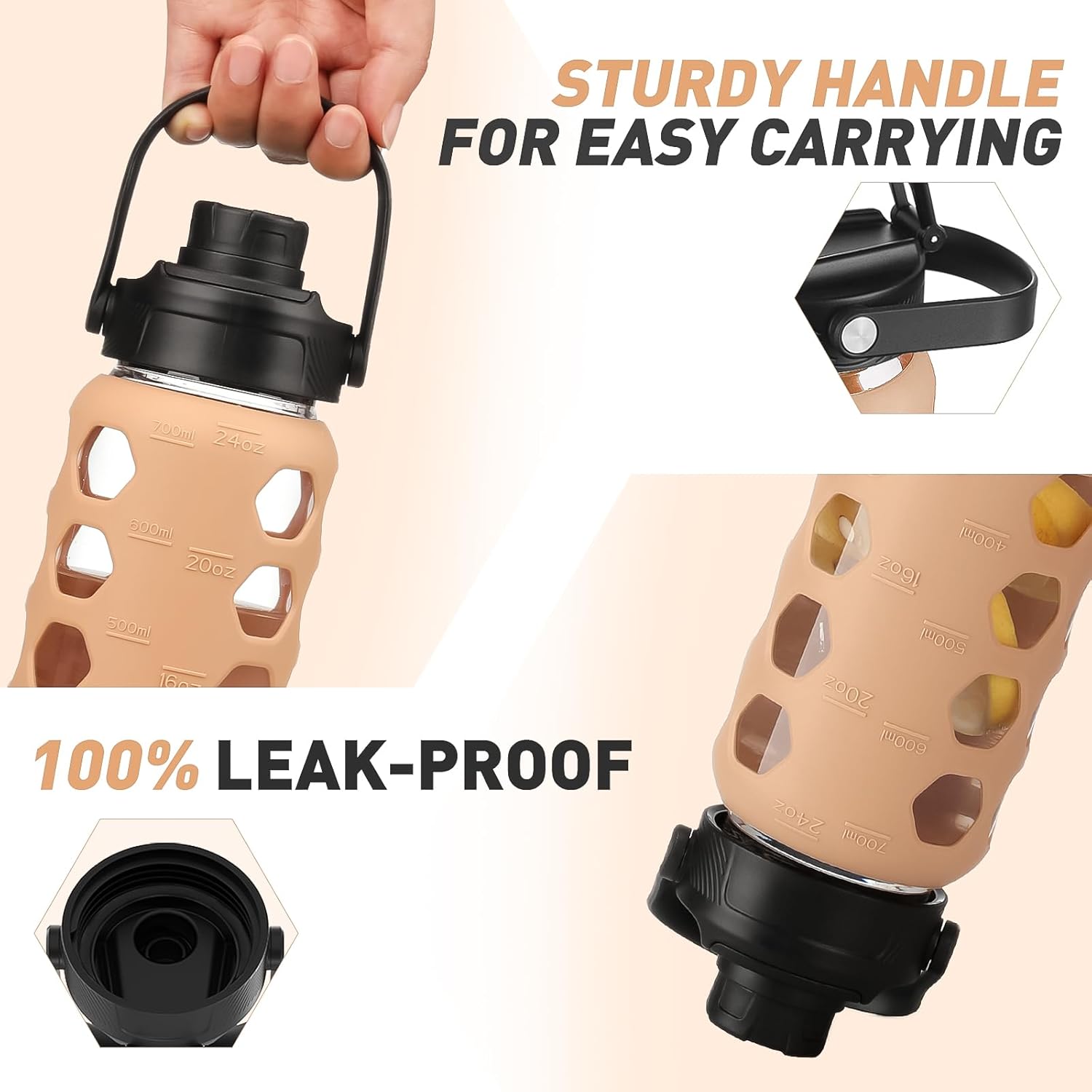 MUKOKO Glass Water Bottles, 24oz Glass Tumbler with Straw, Drinking Bottles with 2 Lids-Handle Spout Lid&Bamboo Straw Lid, Motivational Water Bottle with Time Marker and Silicone Sleeve, 1 Pack-Amber