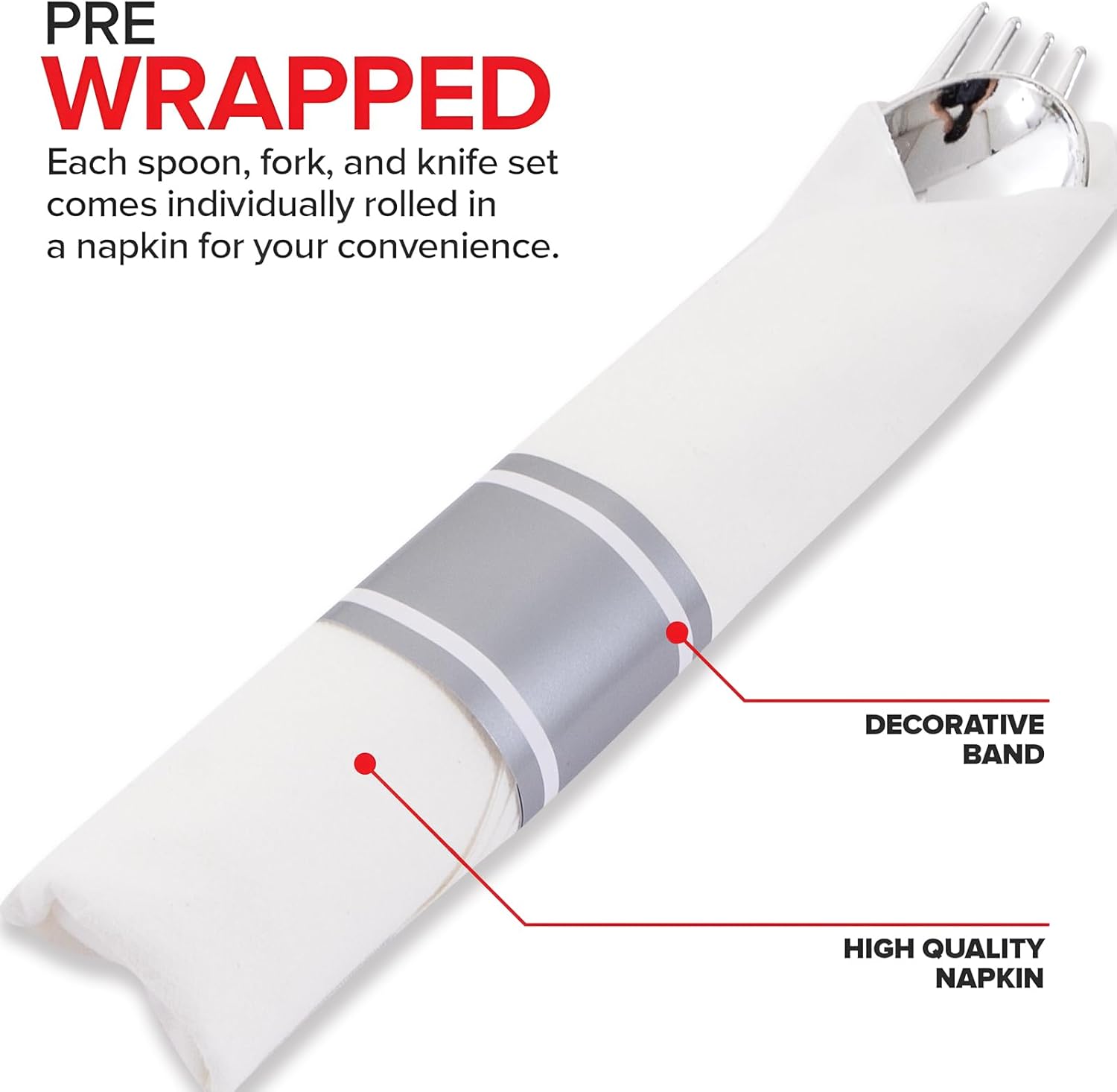 - Pre-rolled Convenience: As the perfect pre wrapped silverware set disposable, you don't even have to worry about buying napkins. Our pre rolled silverware disposable, paired with these pre-rolled napkins, makes your event a breeze.