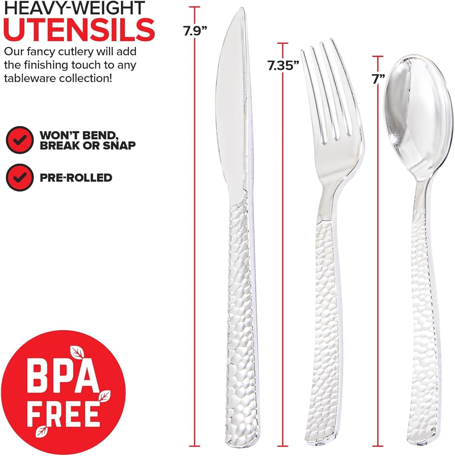400PCS Pre Rolled Silver Plastic Silverware Sets - Heavy Duty Hammered Silver Cutlery - Include 100 Pack Wrapped Disposable Utensils with Napkins for Parties & Dinners & Weddings