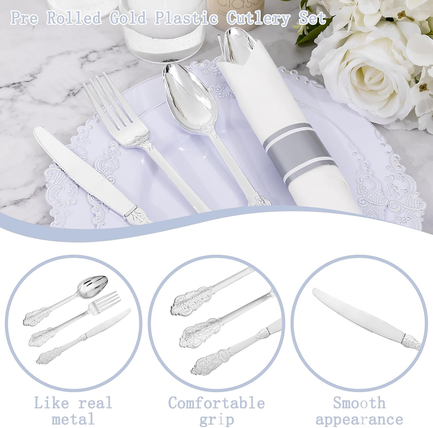 - Elegant and Convenient: The silver plastic cutlery feel smooth and shiny, maintaining the standard of luxury you want. The rolled silverware disposable are very clear and convenient for you dinners. You can throw them away afterwards without having to wash them.