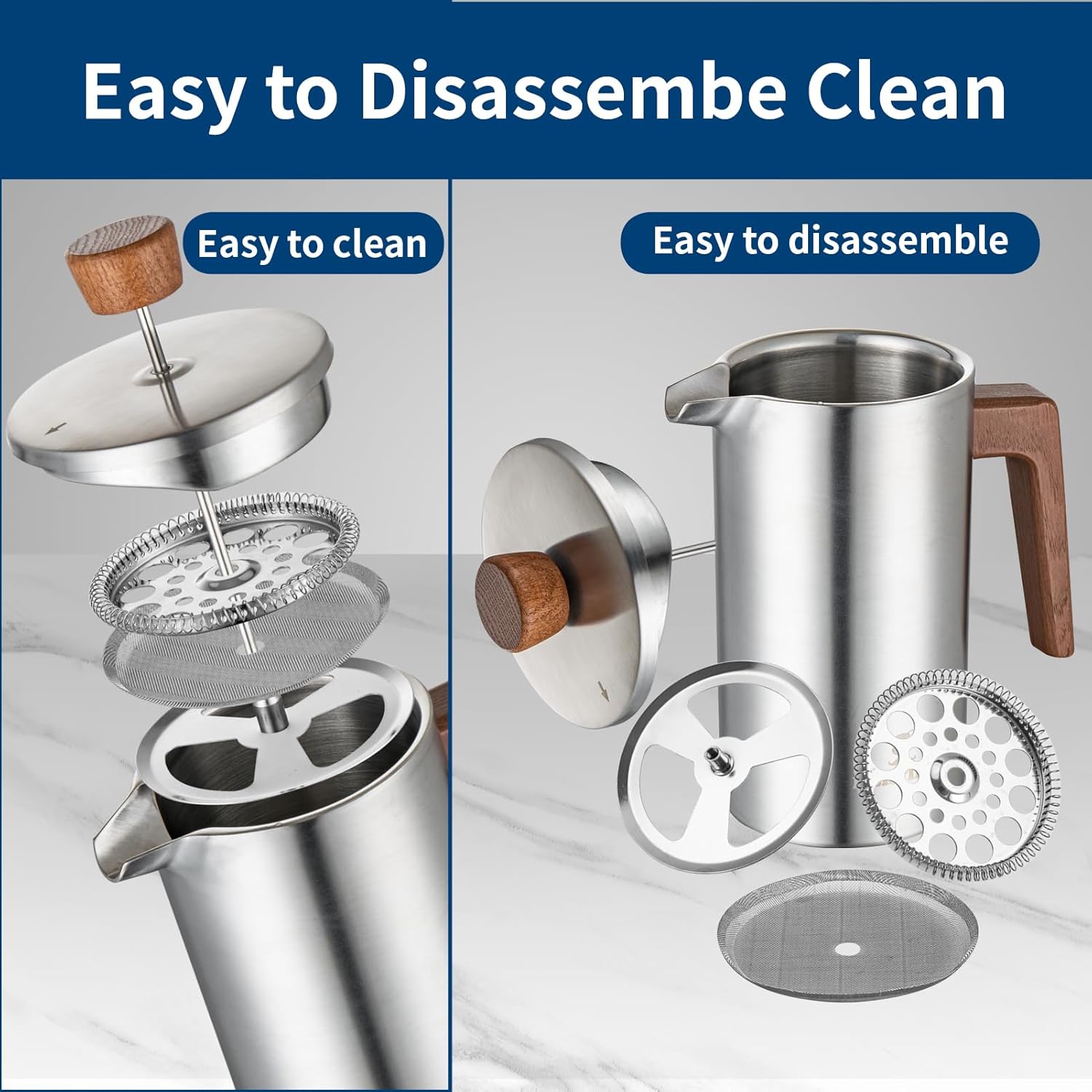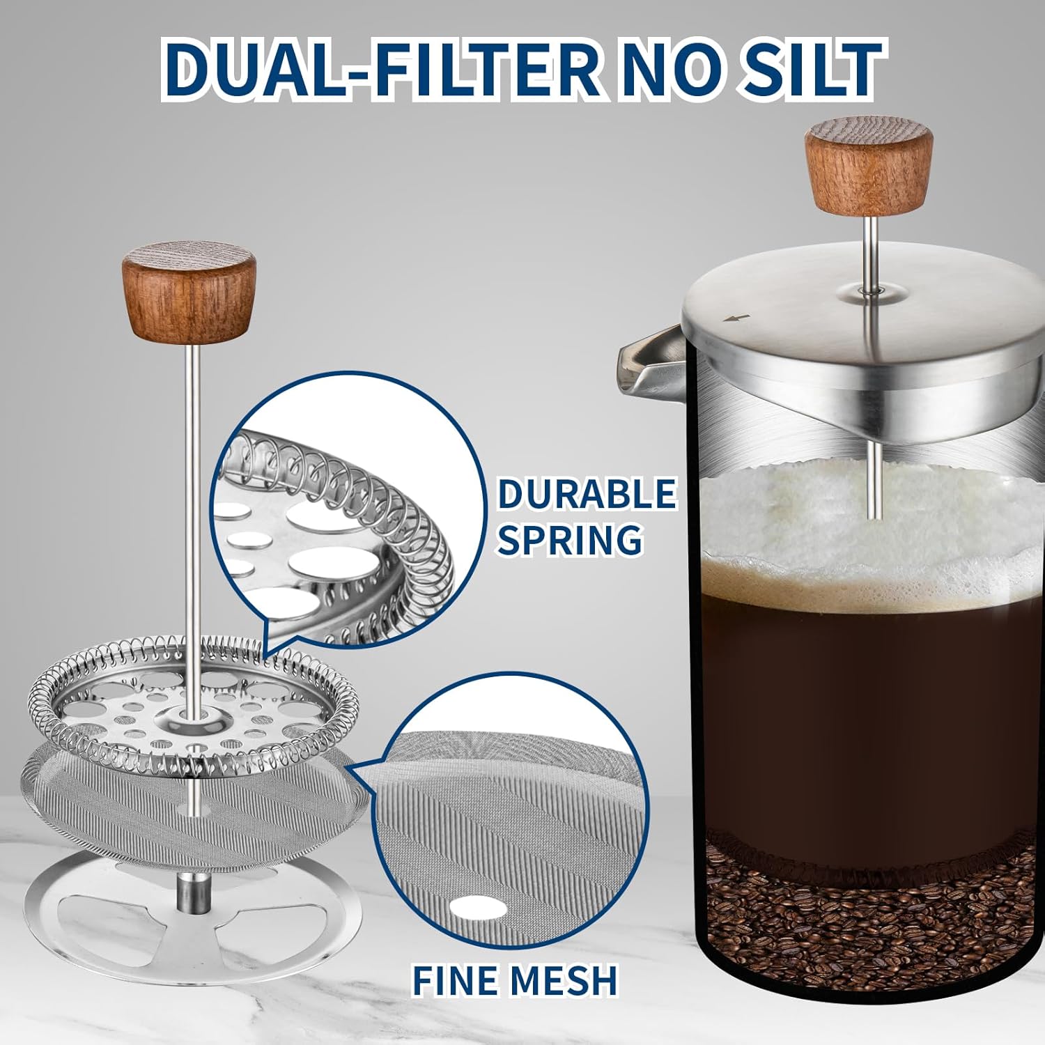 - Our french press coffee maker is made of high-quality 304 food-grade stainless steel, both inside and outside, 3-layer micro mesh filter to ensure no coffee grounds are left on your coffee, and the filter is easy to remove and clean, the preferred way to brew delicious coffee!