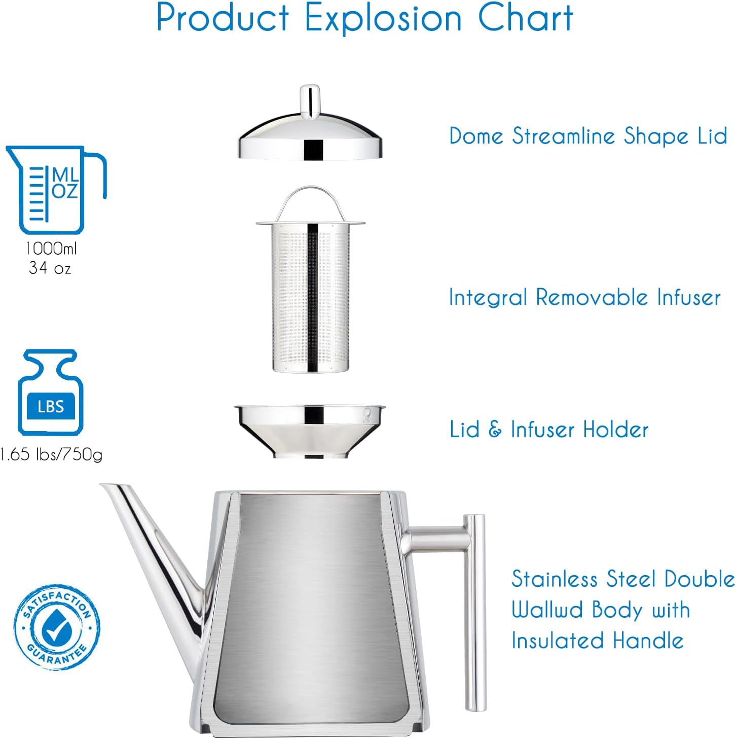 - Double-Wall Insulation: This 34 zo teapot features double-walled stainless steel construction to keep your tea hot for hours.
