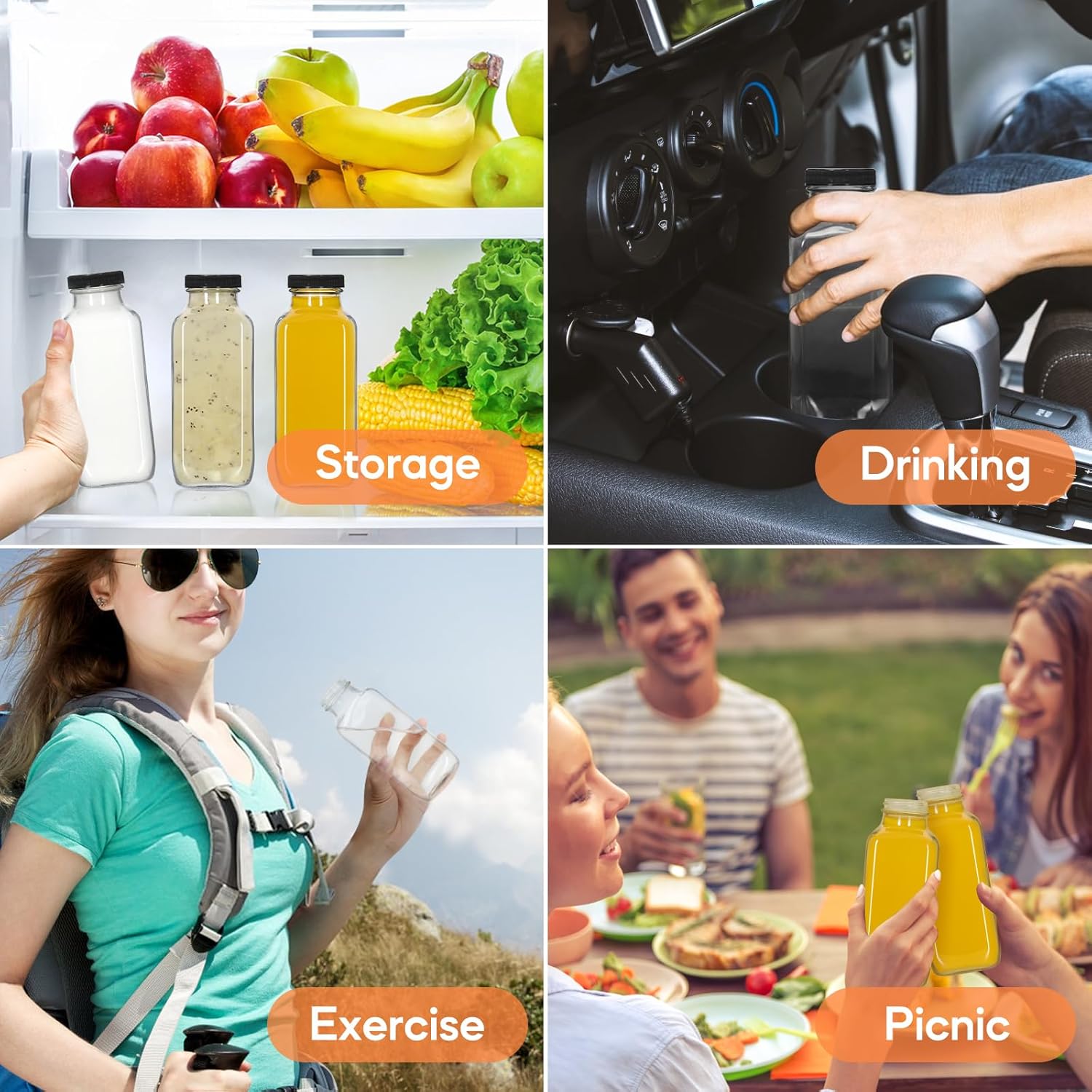STARSIDE 12 oz 3 Pack Glass Juice Bottles with Lids - Square Reusable Drinking Jars for Juicing, Milk, Kombucha - Includes 1 Bottle Brush, 6 Colored Labels