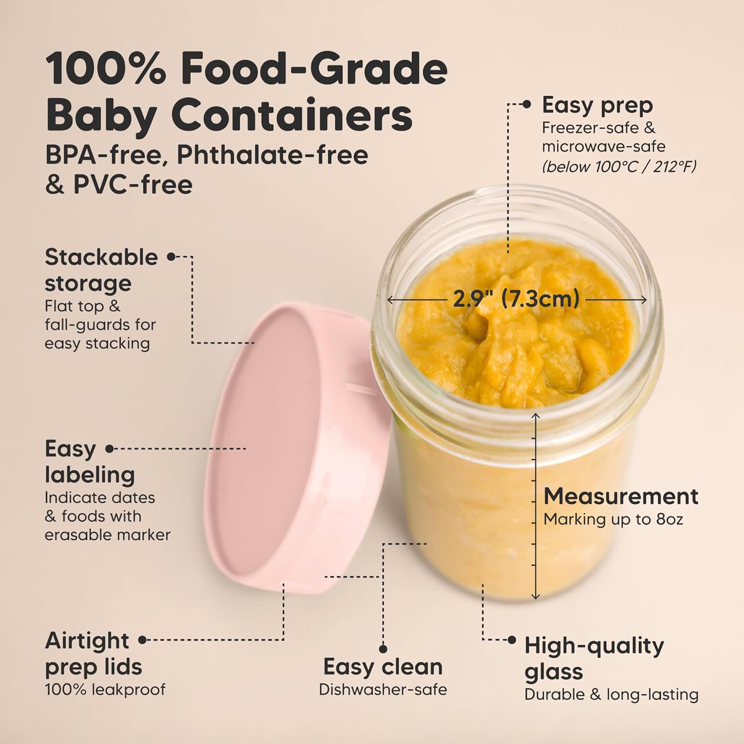 - All-in-One Convenience - Our Prep Glass Baby Food Jars make food preparation, storage, and serving fun and efficient. The jars are versatile for liquids, purees, cut fruits, and snacks. Store, reheat, serve, and feed your baby from one single jar.