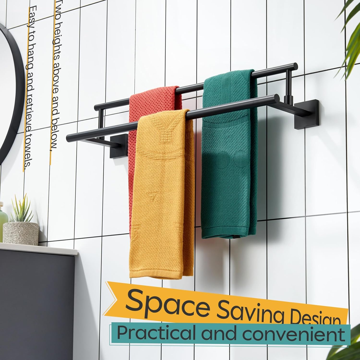 - ◄ MODERN DESIGN ► KOKOSIRI double towel rack with two rails combines elegant square, sleek round, and unique rectangle elements to bring a modern aesthetic to your bathroom, shower room, toilet, kitchen, washroom, pool or garage. You can choose from our series of bathroom hardware for a complete, coordinated look to your place
