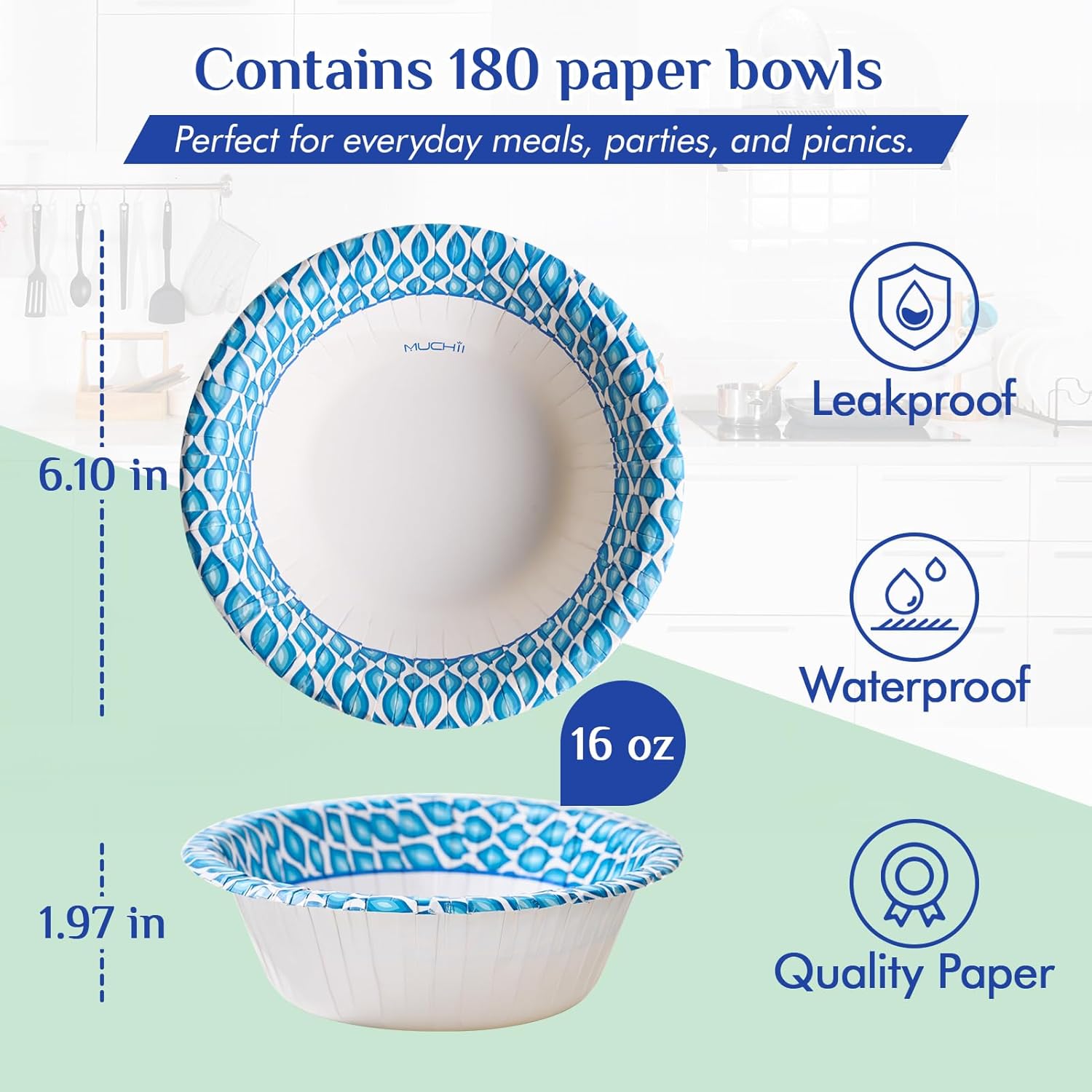 MUCHII 180 Count Paper Bowls 16 oz, Printed Soak Proof Disposable Bowls Bulk for Breakfast, Lunch, and Dinner Meals