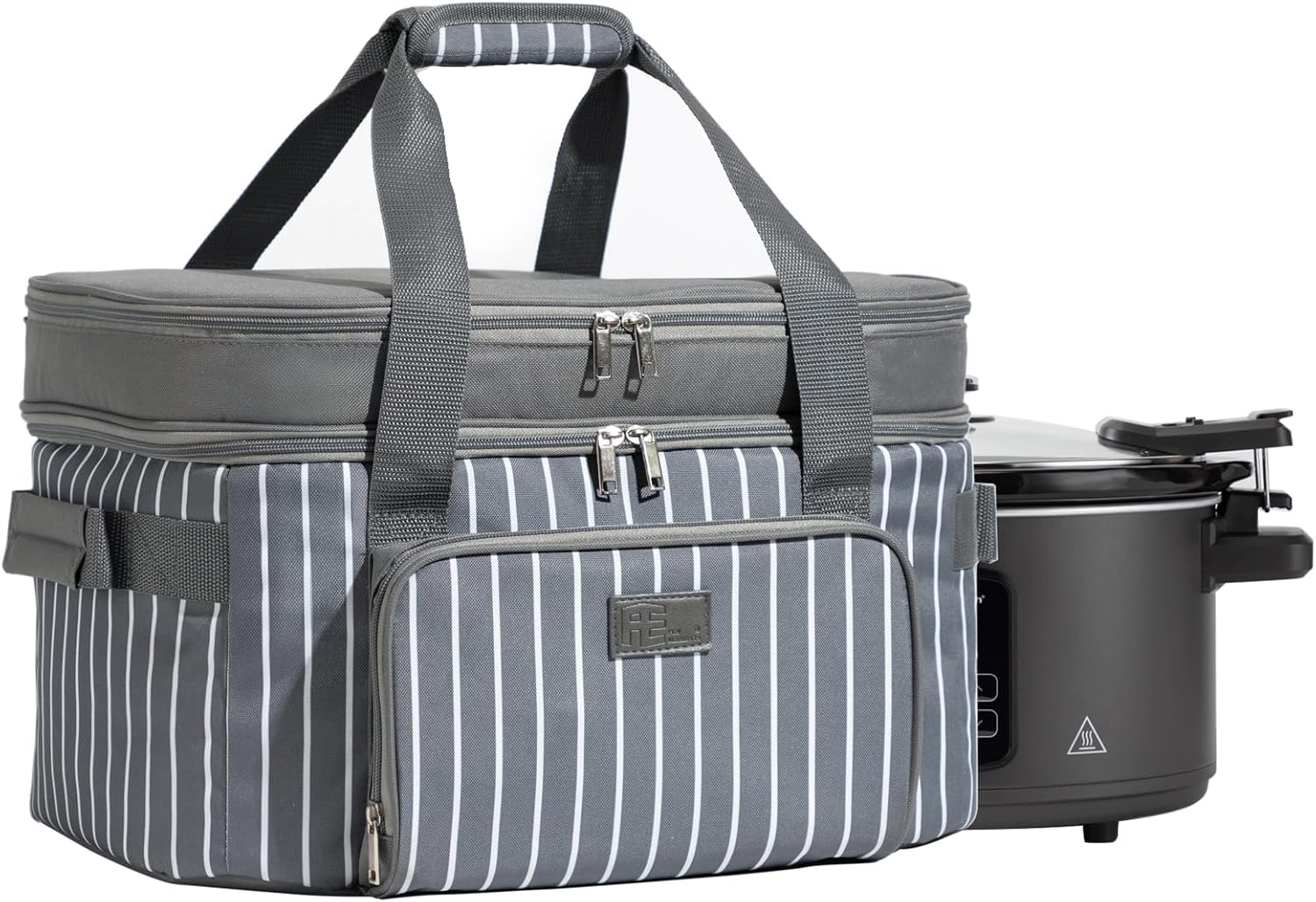 Fun Elements Double Layer Slow Cooker Carrier Bag for 6-8 Quart Oval Crock-Pot, Insulated Crock Pot Travel Bag with Support Pad and Adjustable Straps, Top Zip Compartment and Front Pocket for Utensils