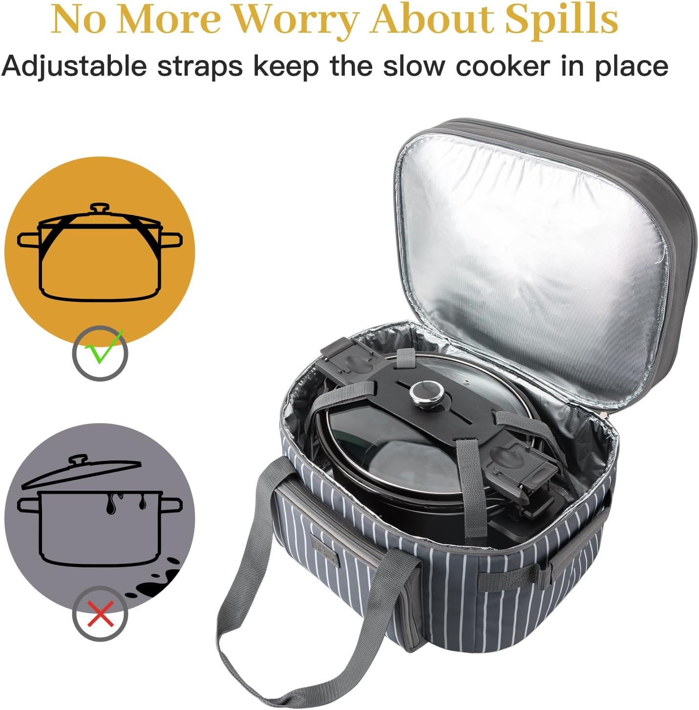 - Never Worry About Spills: The solid support pad and the adjustable straps will keep the pot in the crockpot slow cooker bag securely, spilling or slipping will never happen during transport