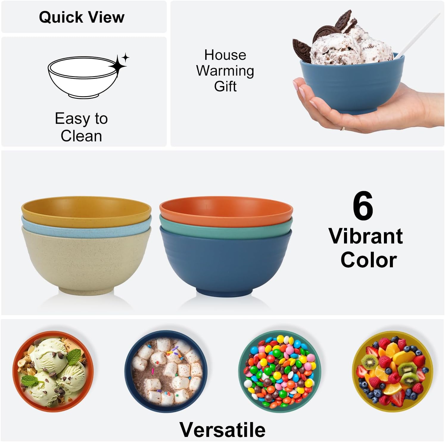 - [Vibrant Color]:Enjoy worry-free snacking with Wrova 10 oz cute bowls - the unbreakable solution to messy snacking. With 6 delightful colors -Orange,Light Blue,Yellow,Beige,Green,Navy Blue- these bowls will quickly become your kids' favorite for desserts, ice cream, and more without the fear of accidental spills or breakage.