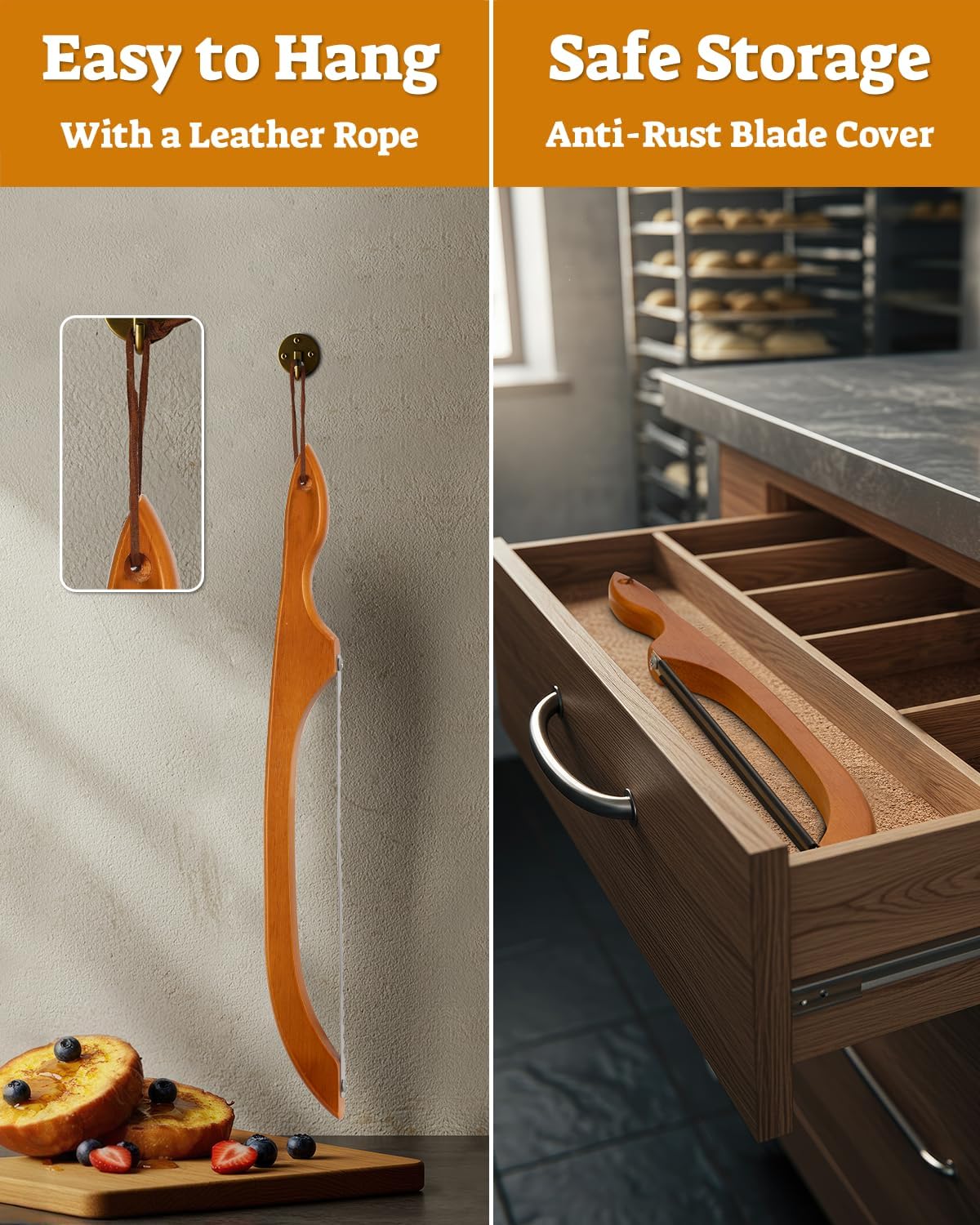 - Sharp Blade with Serrated Saw: The bread baking supplies feature an exceptionally sharp serrated blade that effortlessly slice through all types of bread. The bread cutter for homemade bread saw-like edges ensure clean, precise cuts without tearing or crushing, making it perfect for crusty loaves and soft pastries alike. For added safety, the bread slicer for sourdough rounds comes with a protective sheath to prevent accidental cuts when stored