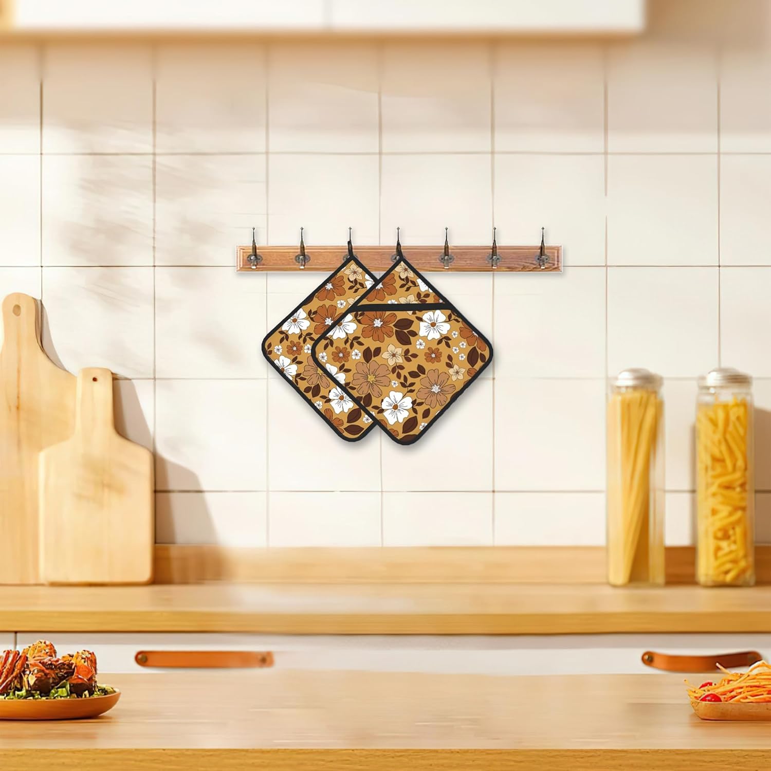 2 Pack Vintage Floral Pot Holders for Kitchen Heat Resistant, White Brown Flowers Potholders for Kitchens Washable for Cooking & Baking & Microwave