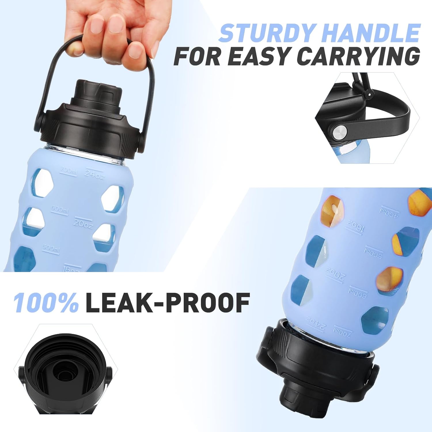 MUKOKO Glass Water Bottles,24oz Glass Tumbler with Straw,Drinking Bottles with 2 Lids-Handle Spout Lid&Bamboo Straw Lid,Motivational Water Bottle with Time Marker and Silicone Sleeve,1 Pack-Glacier
