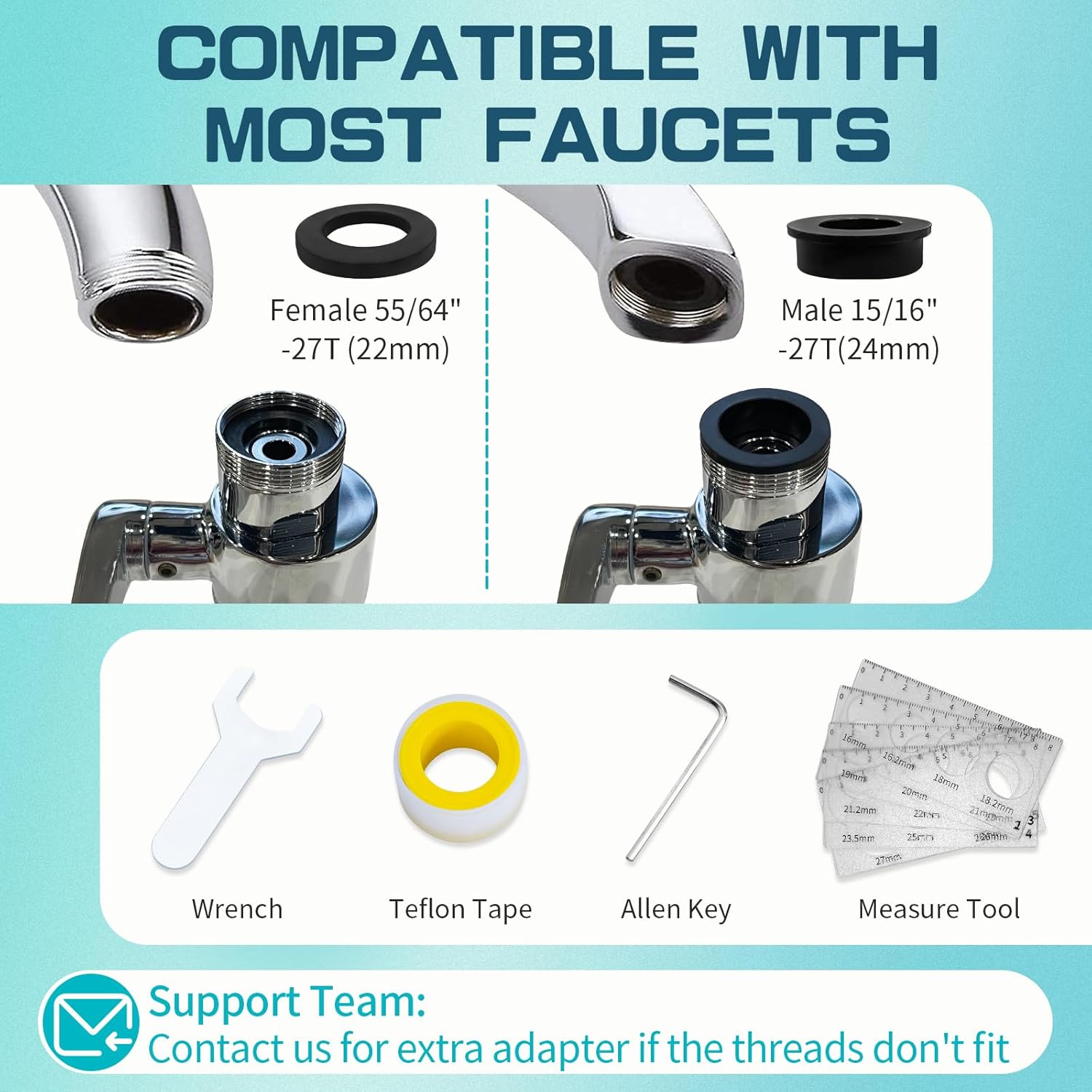 - 【Easy Installation】Compatible with most bathroom/kitchen/laundry sink faucets. CECEFIN Faucet aerator provides 2 sizes for connection: female 55/64”-27T(22mm), male 15/16”(24mm). Included tools: ①Single open end wrench to screw on/screw off faucet extender aerator ②Allen key wrench to adjust tightness of each elbow and solve leaking issues when they are loosen. We would to help if the included connectors don’t fit your faucet, CECEFIN provides 7x24h buyer support and after-sales service