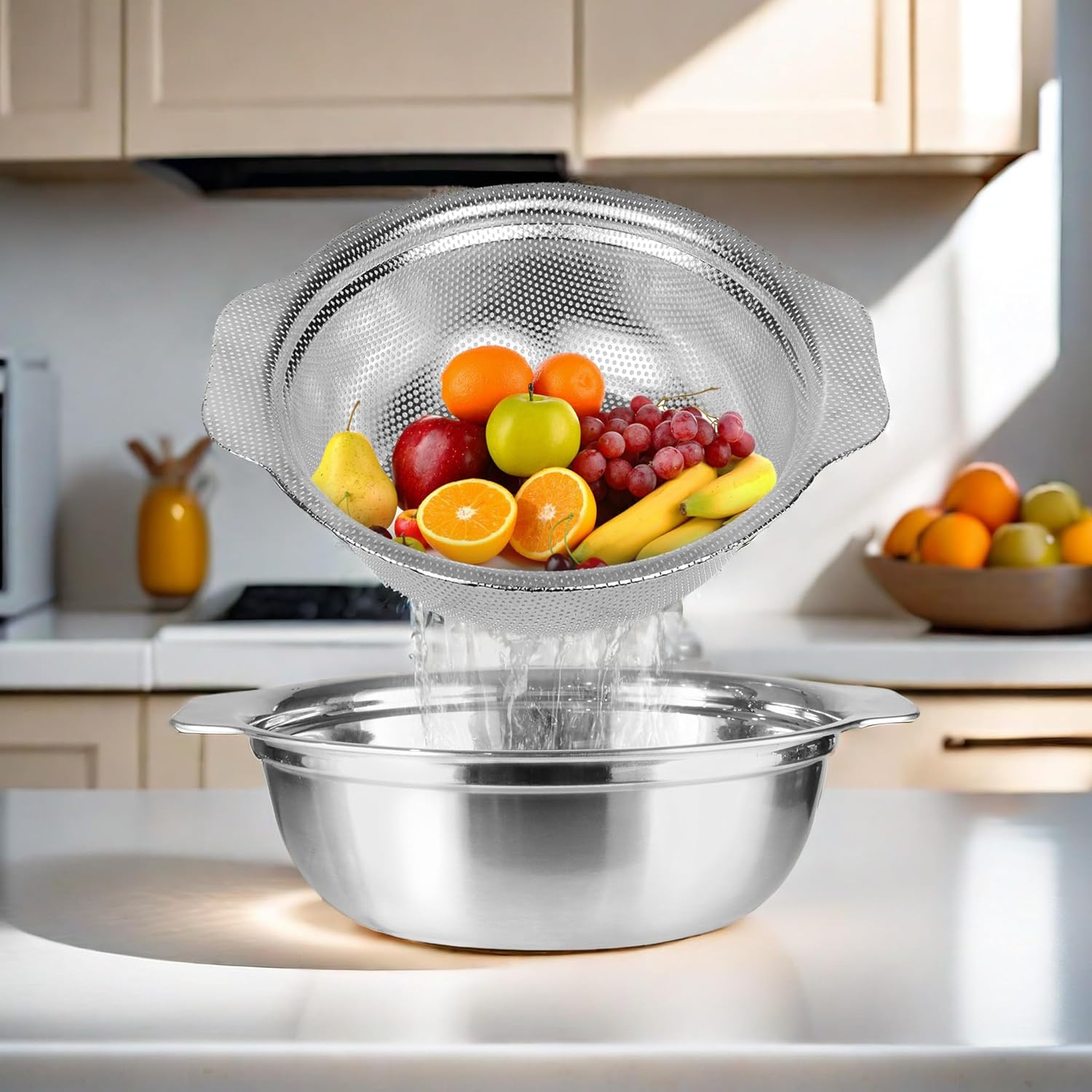 - Colander for Kitchen:The colander has 2mm pore size is great for washing, rinsing, draining;strain pasta, noodles, orzo, vegetables and fruits. 5 quart Mixing bowl and colander. Perfectly used for pasta, spaghetti, noodles, vegetable, mung bean, meat and seafood, Also can be used as fruit container and salad mixing bowl.