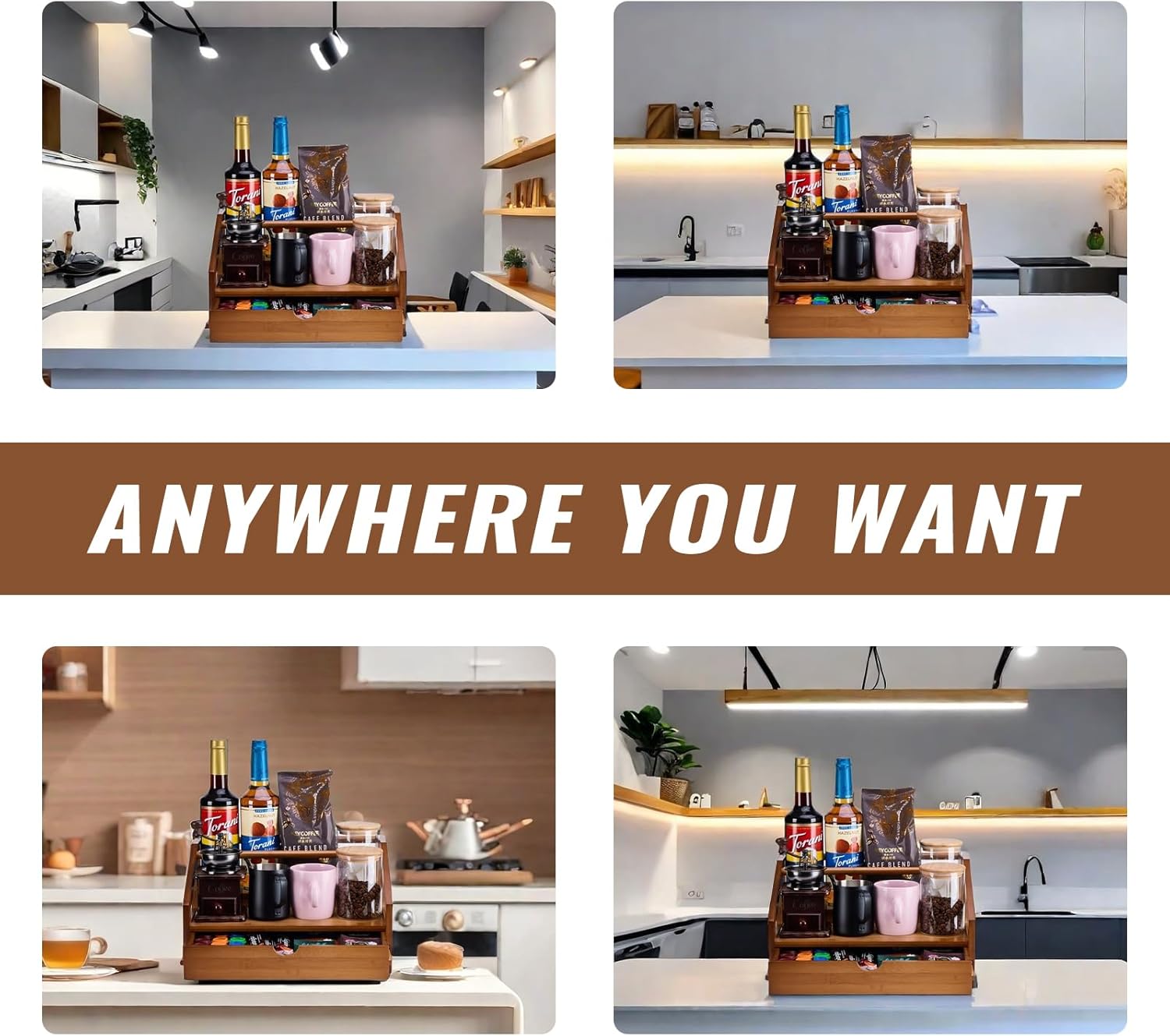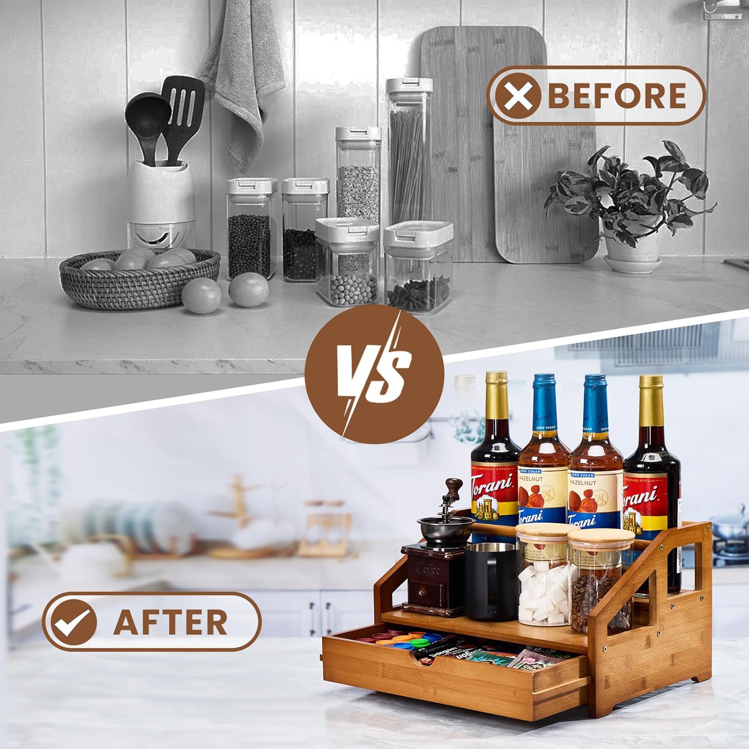 - Multifunctional design: The coffee organizer has two layer display and a drawer box for a more stylish appearance. It can be used to organize all kinds of kitchen and coffee containers (coffee syrup, wine, spirits, olive oil, vinegar, spices and other bottles). Drawer boxes can store coffee capsules, stirrers, straws, sugar or other small items. Ideal for coffee shops, coffee stations, kitchens, bars or cafe counters