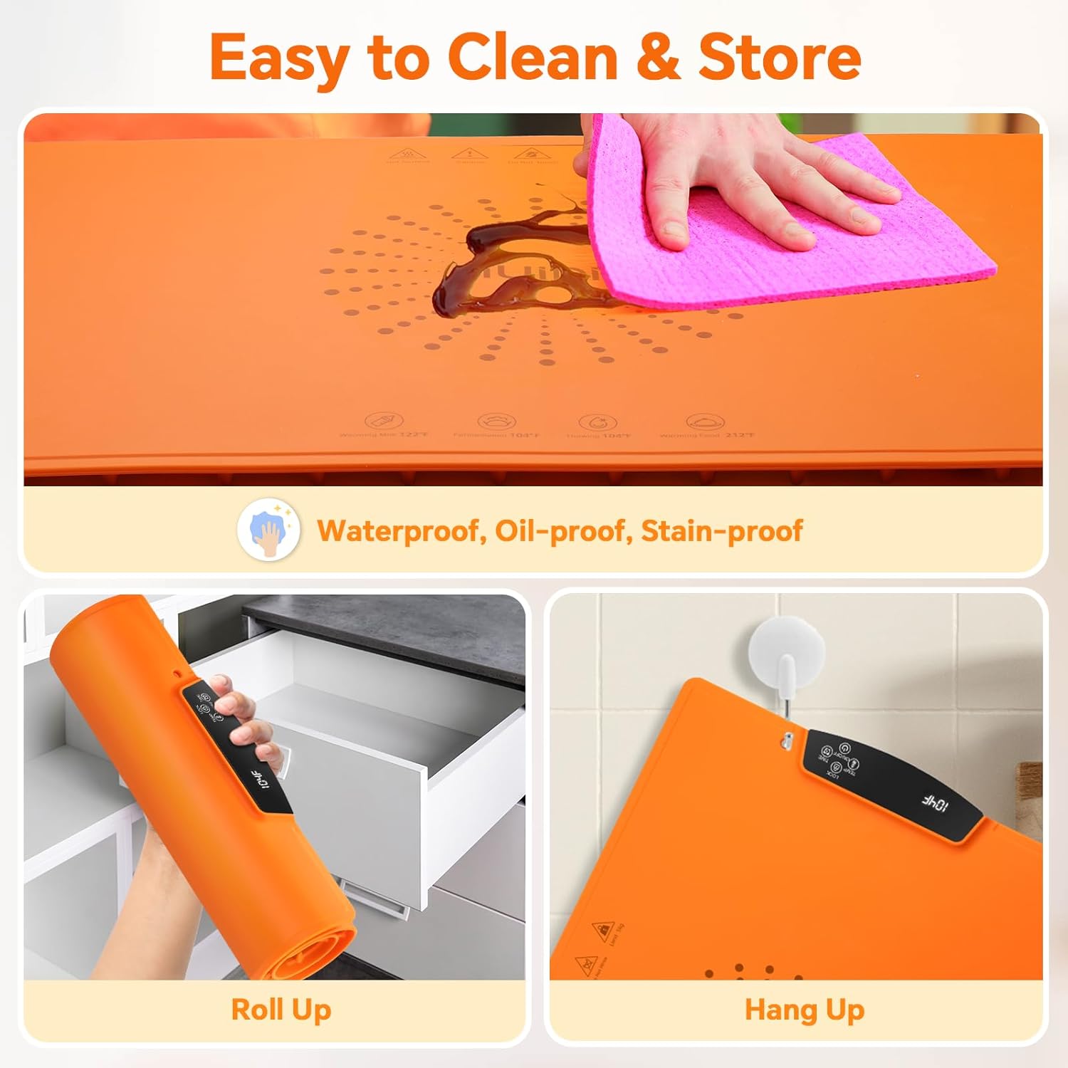 - Easy to Clean Silicone Nano Material: Durable and a cinch to clean! The portable kitchen warming mat is easy to store and carry. It offers three storage options - roll up, lay flat, or hang up. It is the perfect choice as a warming kitchen mat for parties buffet