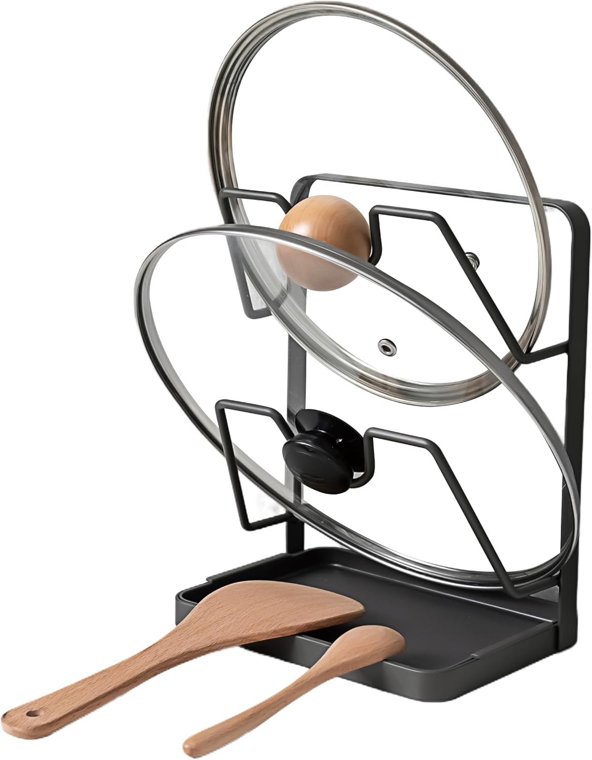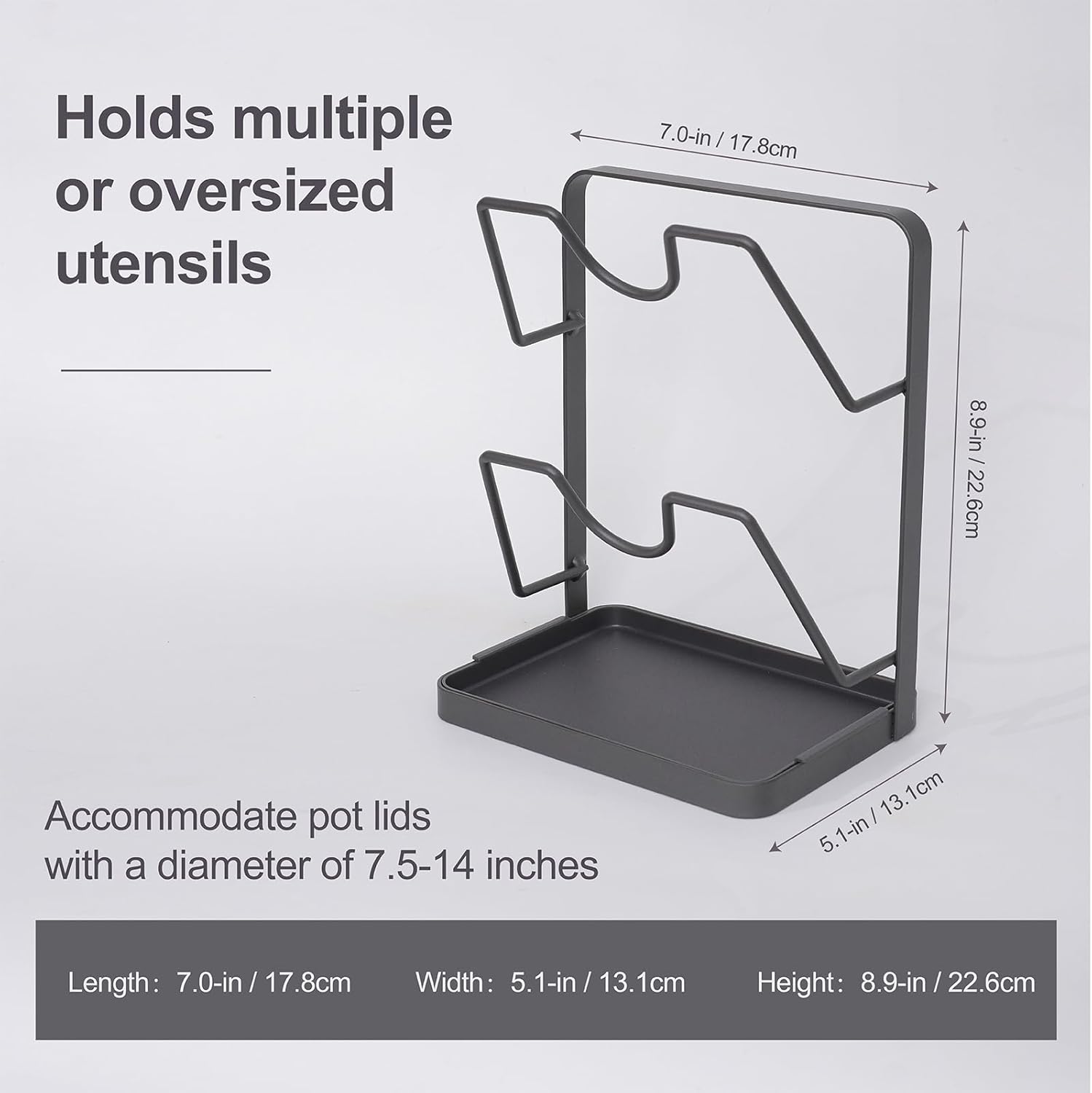 - 【Space Saver & Versatility】Our pot lid stand is designed to accommodate most pot lids, fitting diameters from 7.5 to 14 inches. It is space saving for place 2 lids vertically without taking up much space, making this pan lid holder a practical addition to any kitchen