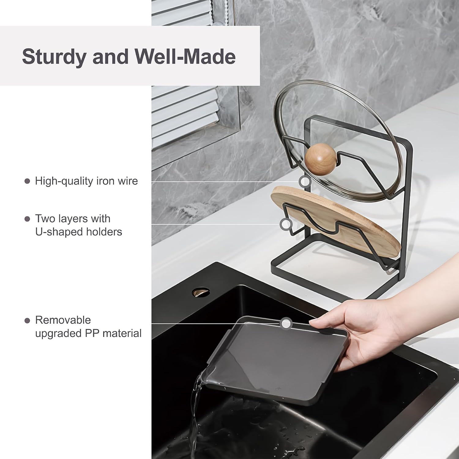 - 【Sturdy and Well-Made】This pot lid holder and spoon rest crafted from high-quality Iron, ensures long-lasting use. The drip tray is made of upgraded PP material, guaranteeing its durability