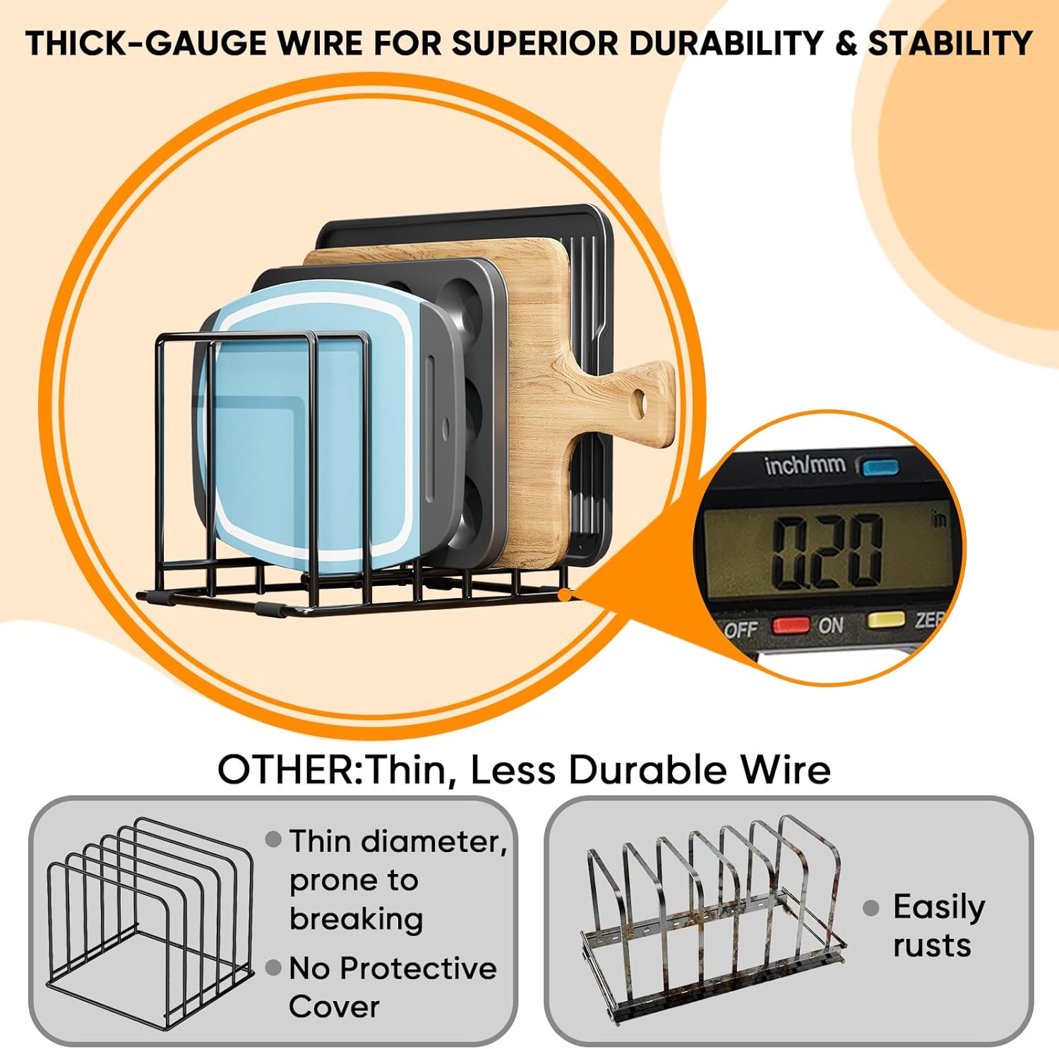 - ๐๐จ๐ฆ๐ฉ๐๐๐ญ ๐๐ข๐ณ๐, ๐๐๐ง๐๐ซ๐จ๐ฎ๐ฌ ๐๐๐ฉ๐๐๐ข๐ญ๐ฒ: With 5 evenly spaced slots (1.05" apart) and a space-saving footprint (7.65โ x 7.38โ x 6.15โ), this organizer fits perfectly on countertops or inside cabinets. It accommodates thin cookie sheets and bulky baking pans alikeโideal for organized, clutter-free kitchens.